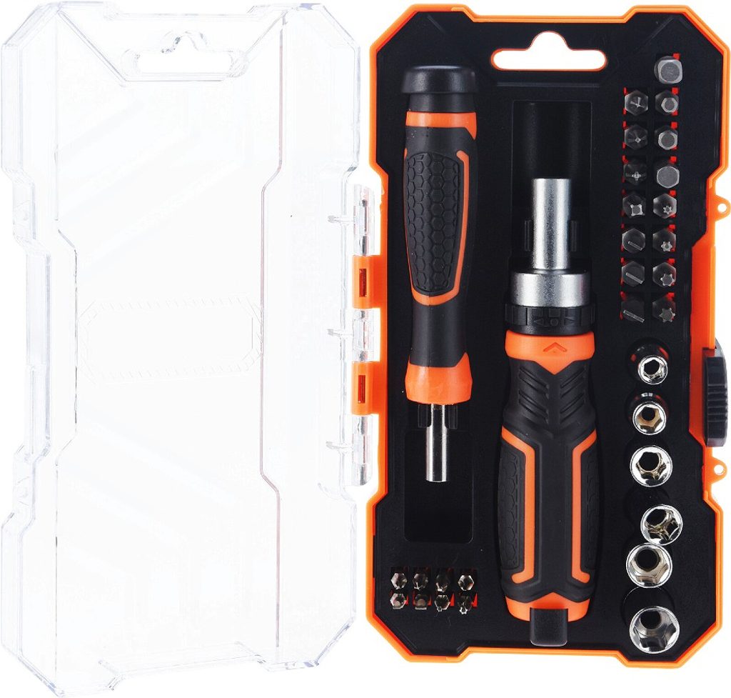 Tato kvalitní sada obsahuje ráčnový šroubovák, mini šroubovák a širokou škálu bitů, ideální pro různé opravy a montážní práce. Je to skvélé vybavení pro domácí dílnu i profesionální použití.