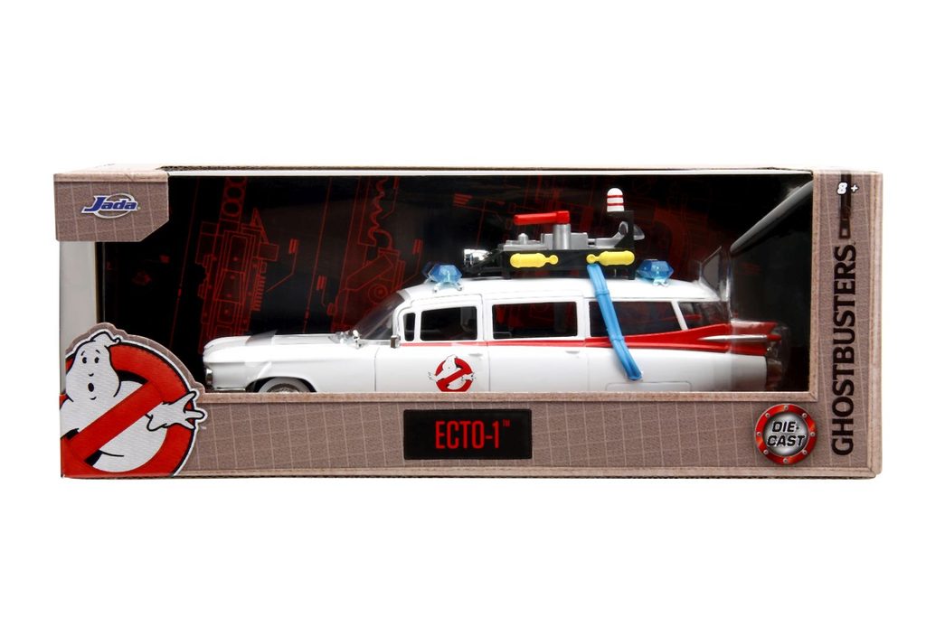 Kovový model auta Gostbusters ECTO-1 v měřítku 1:24 na volnoběh. Otevírací dveře. Velikost 23 cm.