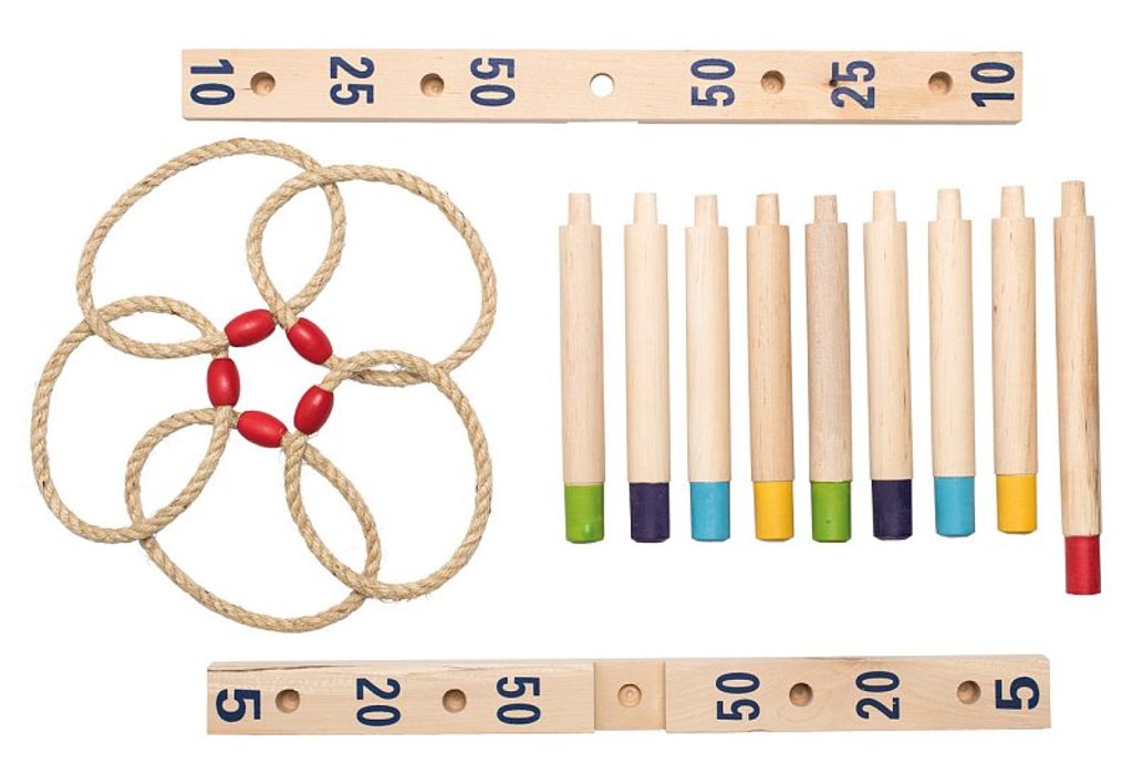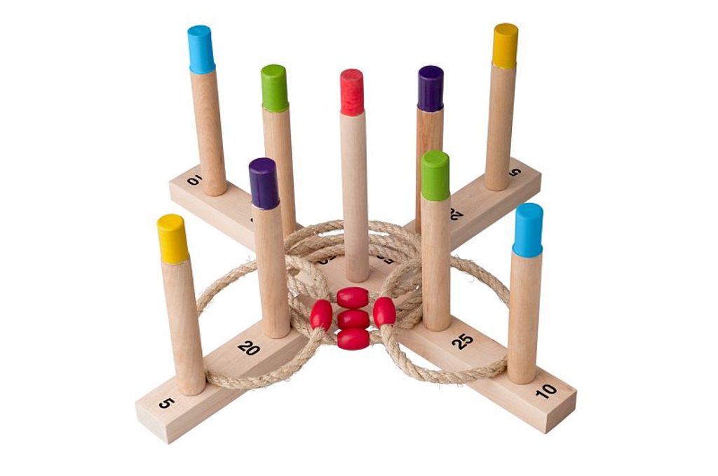 Zábavný způsob, jak trénovat obratnost. Cílem je házet 5 pletených provazových kroužků na dřevěný kříž s tyčkami a získat co nejvíce bodů.