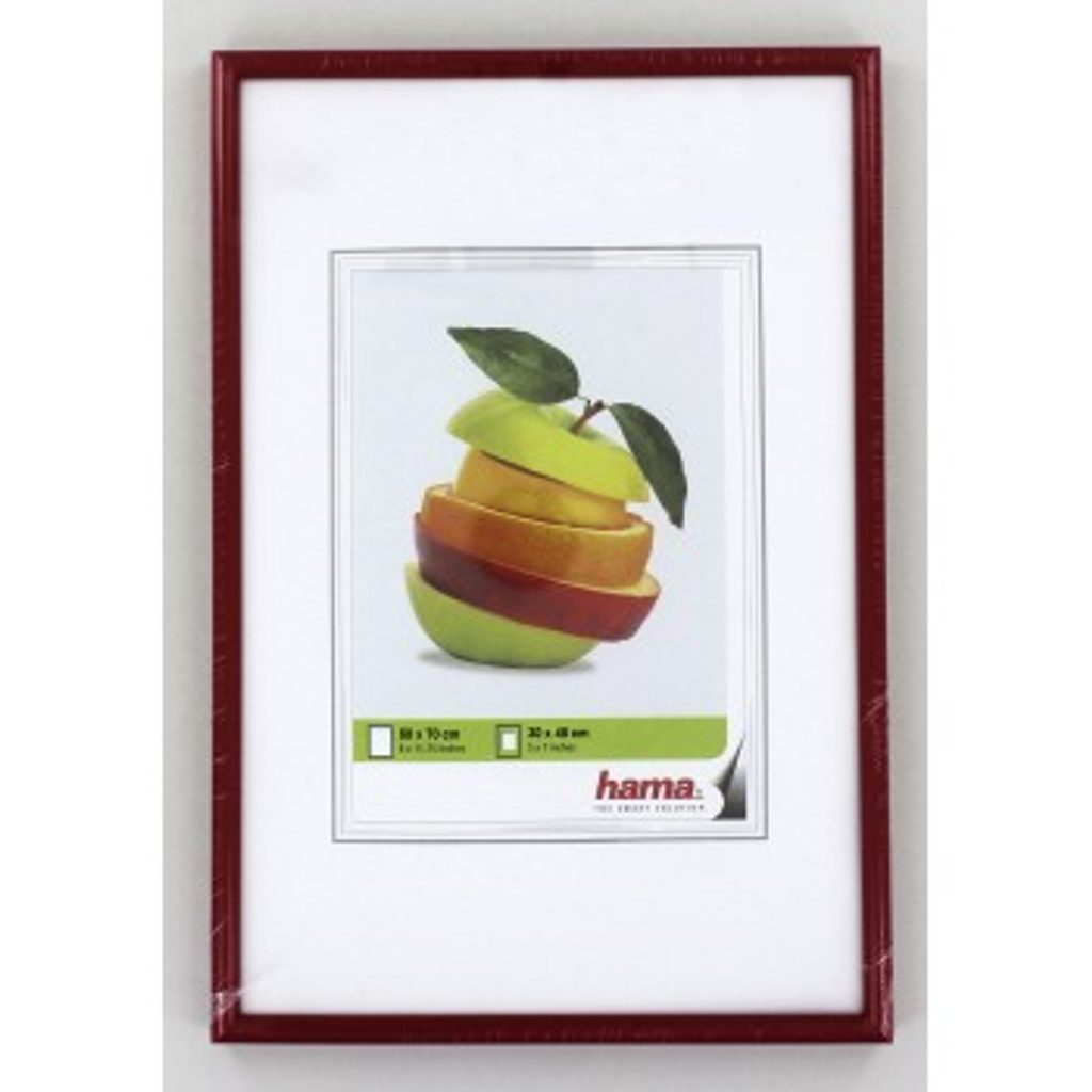 - Stylish plastic frame - With a mount - Ground, high-quality glass - Specially coated plastic border for long-lasting frame colours - Precision mitre - Hama EasyClip closure system for quick and easy framing - Includes a heavy-duty hook with mounting template Technical Details: - Type of Glass: Reflex - Approx. Border Height: Approx. 20 mm - Approx. Border Width: Approx. 13 mm - Frame Size: 50 x 70 cm - Max. Mount Thickness: 1.7 mm - Picture Size: 30 x 45 cm - Colour: Red - Line: Sevilla