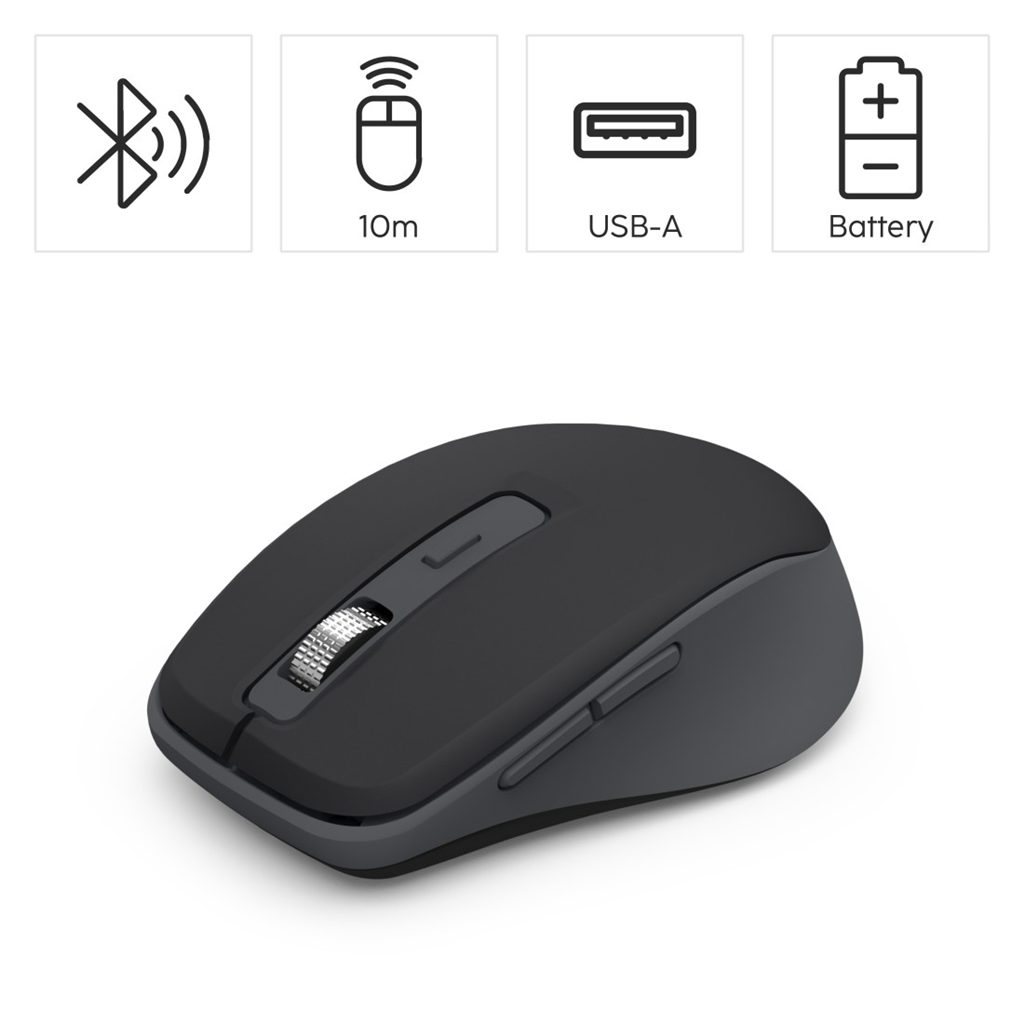 - 7tlačítková bezdrátová optická myš s volitelným připojením na tři zařízení: 1x bezdrátový USB přijímač a 2xBluetooth
