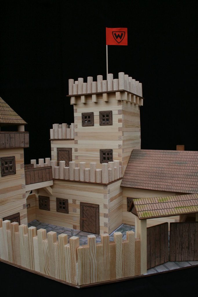 Dřevěná stavebnice Walachia ke slepení - Hrad. Slepovací stavebnice Walachia jsou dřevěné modely domečků a staveb z Valašského kraje v měřítku 1:32. Základem jsou dřevěné hranolky 9x9 mm a k tomu jsou v sadě vždy všechny papírové doplňky - okna, dveře, střešní části atd. Pro lepení se používá lepidlo Herkules, není však součástí stavebnice. Přiložený je montážní návod a malé kapitoly z historie lidové architektury.Níže je označení obtížnosti číslem 1 - 5, přičemž 1 je nejlehčí. Počet dílů stavebnice: 607. Rozměry: 53x41x46 cm. Obtížnost: 4