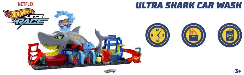 V seriálu Hot Wheels: Závod! na streamovací platformě Netflix ovládl městskou myčku Hot Wheels® obrovský žralok, který se chce vrhnout do akce plné změn barev! Děti přejedou s přibaleným angličákem Color Reveal přes rampu a vjedou do žraločí tlamy, pak stisknou žraločí hlavu, aby změnily barvu vody a odhalily dekor auta. Vytáhněte žraloka a sledujte, jak se auto řítí jeho vnitřnostmi, zatímco přebytečná voda odtéká pryč. Klepnutím na žraločí ocas vypustíte auta z garáže nebo do nádrže s ledově studenou vodou a zažijete překvapení v podobě změny barvy.