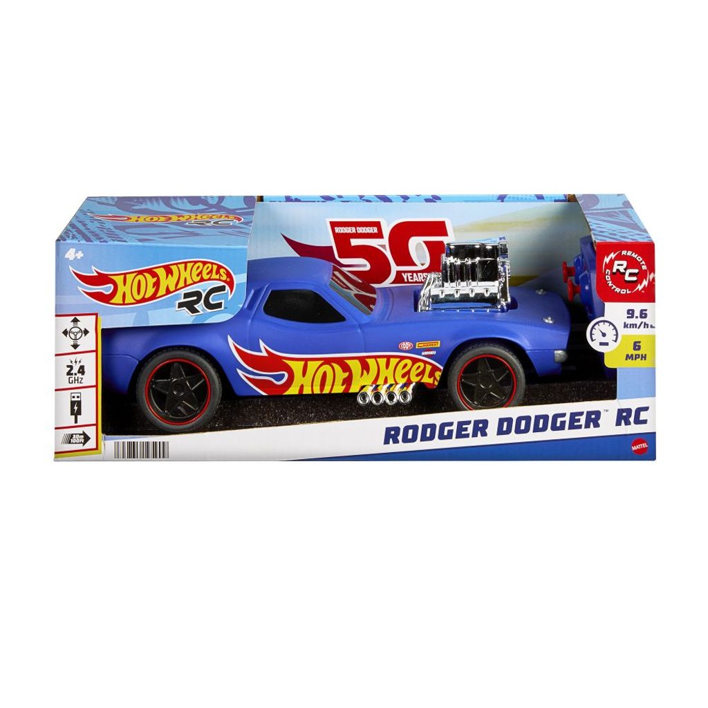 Usedněte za volant legendy Hot Wheels® s Rodgerem Dodgerem na dálkové ovládání v měřítku 1:16. Toto vysoce detailně propracované vozidlo má originální grafiku a je vybaveno plně funkčními RC funkcemi. Jeho frekvence 2,4 GHz zabraňuje rušení při závodech s jinými RC autíčky - v soutěžích dosahuje rychlosti až 11 km/h. (Další auta se prodávají samostatně.) Dobíjení pomocí kabelu USB umožňuje 90 minut hry na jedno nabití; dálkový ovladač vyžaduje dvě baterie AAA. Baterie se prodávají samostatně. Barvy a provedení se mohou lišit.