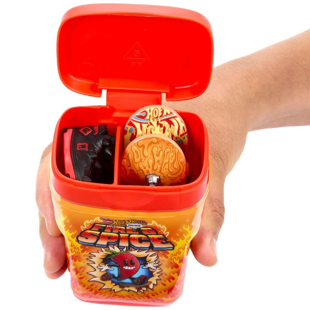 Vezměte si prkna na cesty s krabičkou Hot Wheels®, která pojme a ukryje 2 plně sestavené fingerboardy a pár skate a která připomíná balení žvýkaček! Otevřete "příchuť" jako "Bubble Blast" nebo "Snakeberry Sour", každá krabička je zdobená stylovou grafikou. Uvnitř jsou 2 exkluzivní prkna a pár odnímatelných skate bot s odpovídající kresbou a barvami. Každé balení se prodává samostatně dle aktuální nabídky.