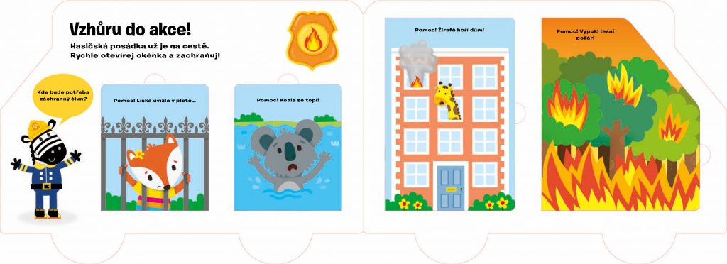 V tomto zábavném leporelu s veselými obrázky a více než 25 otevíracími okénky se děti seznámí s rozmanitou a záslužnou činností hasičů.