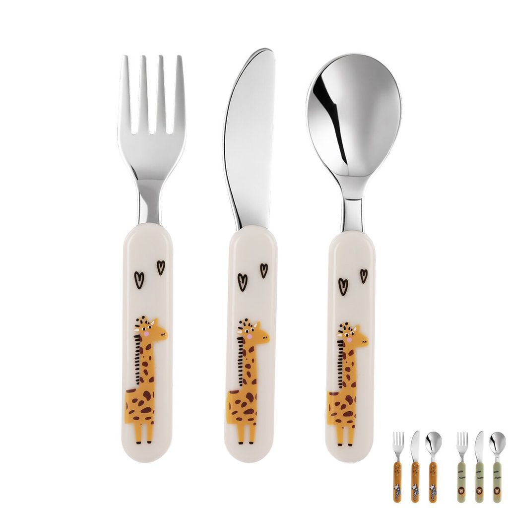 154219 Dětský příborový set s veselým motivem zvířátek pro první stolování. Obsahuje lžíci, vidličku a nůž. Materiál: nerezová ocel, plast PS. Tvar přizpůsoben dětským rukám pro snadné a bezpečné používání. Lze mýt v myčce na nádobí. Rozměry: (délka/šířka) lžíce 14/3,5 cm, vidlička 13,5/2,5 cm, nůž 14/2 cm.