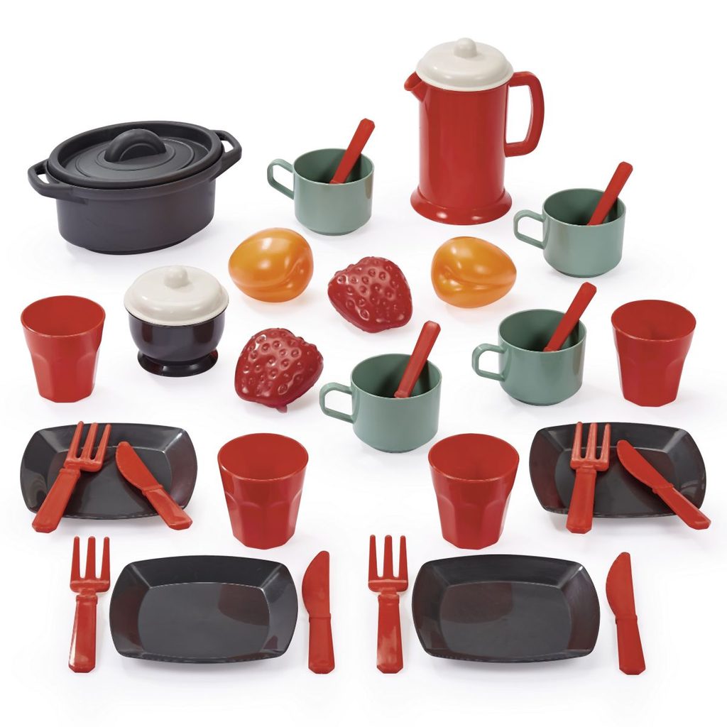 Jídelní set obsahuje vše potřebné pro nachystání pohoštění, vč. nádobí. 4 talíře, sada příborů, pohárky, hrníčky, konvička s víčkem, hrnec s víkem, ovoce a další.
