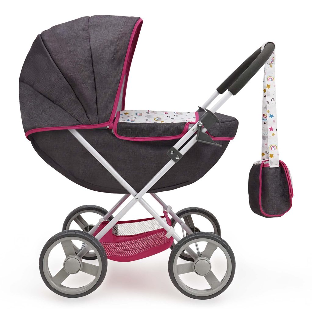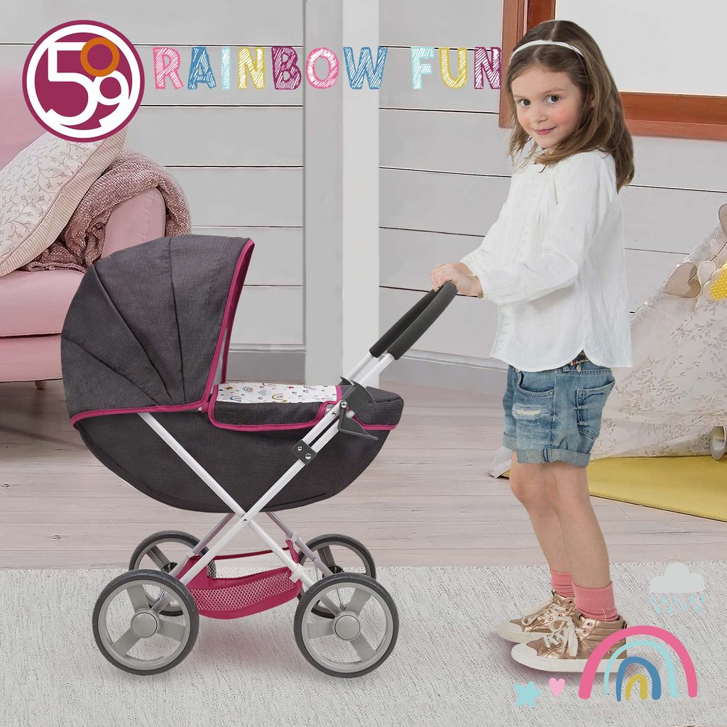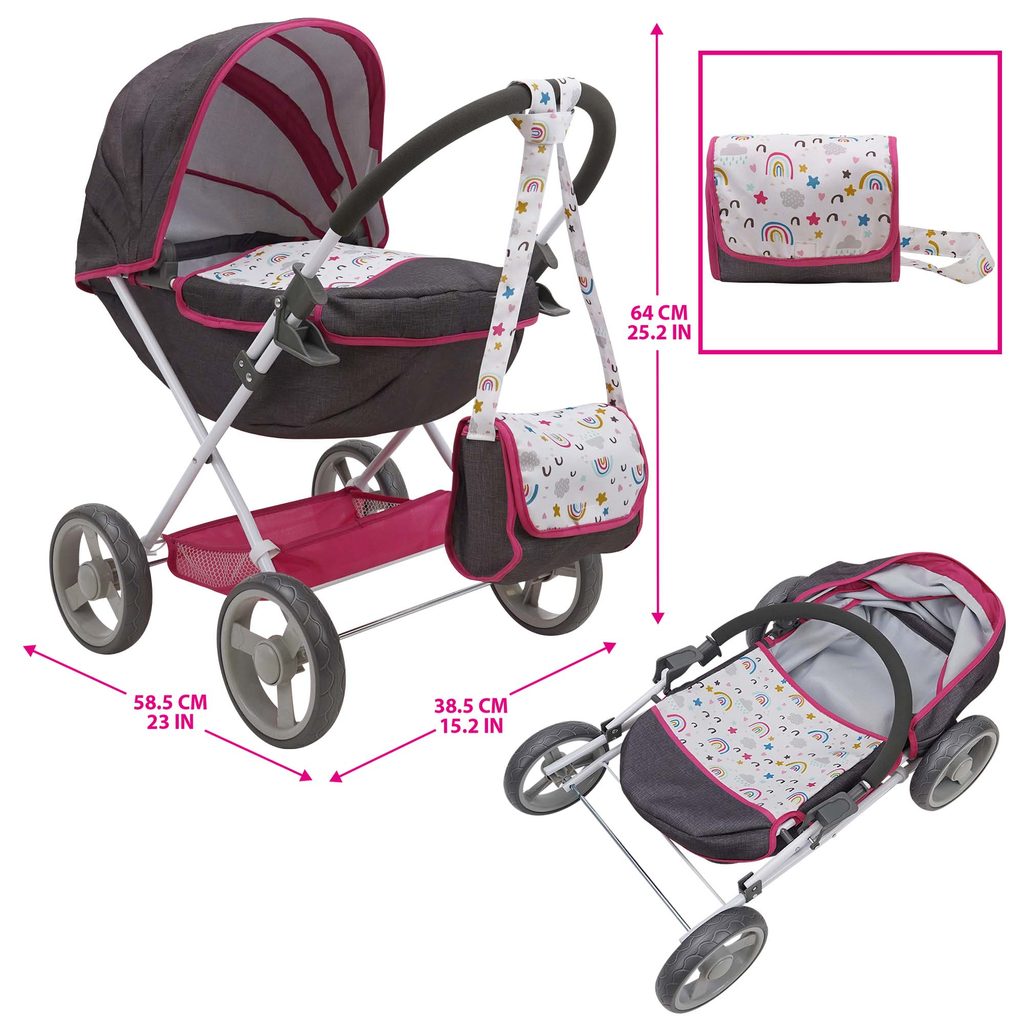 Kočárek pro panenky 509 Crew Carol. Komfortní pěnová rukojeť. Stahovací stříška. Velký nákupní košík. Skladací pro snadné skladování. Pohodlně se hodí pro panenku 13" - 18"