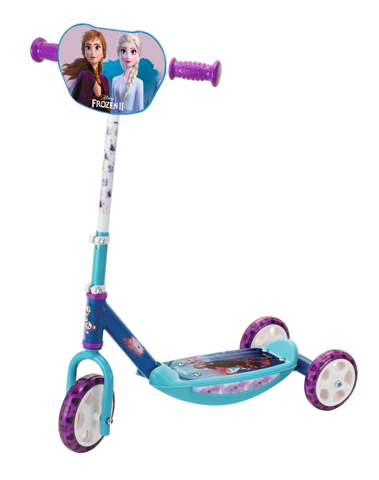 Třpytivá koloběžka v licenci Ledové království 2 s kovovým rámem má výškově nastavitelná řídítka (67 a 70 cm) a 3 kolečka s protihlukovou úpravou pro lepší stabilitu. S protiskluzovým stupátkem. Max. nosnost 20 kg. Rozměry: 55 x 32 x 70 cm.