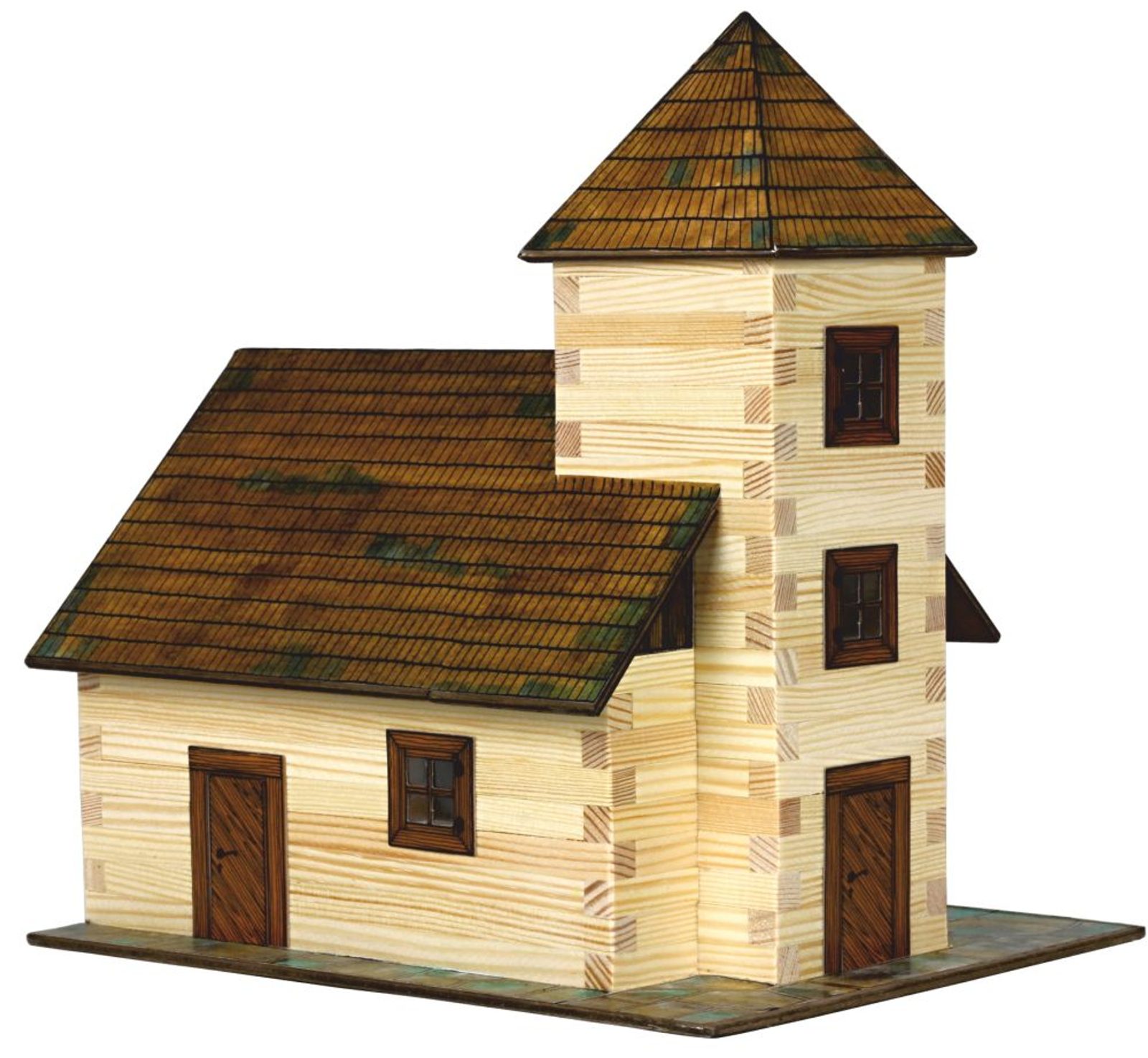 Dřevěná slepovací stavebnice Walachia - Kostel. Slepovací stavebnice Walachia jsou dřevěné modely domečků a staveb z Valašského kraje v měřítku 1:32. Základem jsou dřevěné hranolky 9x9 mm a k tomu jsou v sadě vždy všechny papírové doplňky - okna, dveře, střešní části atd. Pro lepení se používá lepidlo Herkules, není však součástí stavebnice. Přiložený je montážní návod a malé kapitoly z historie lidové architektury.Níže je označení obtížnosti číslem 1 - 5, přičemž 1 je nejlehčí. Rozměry: 23 x 16 x 24 cm Počet dílů: 213 Obtížnost: 5