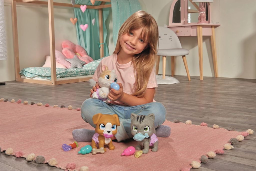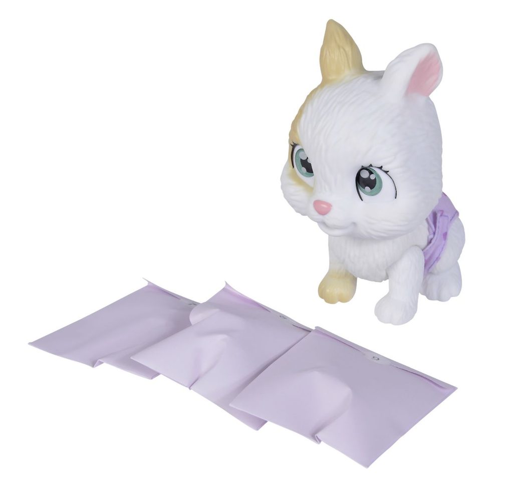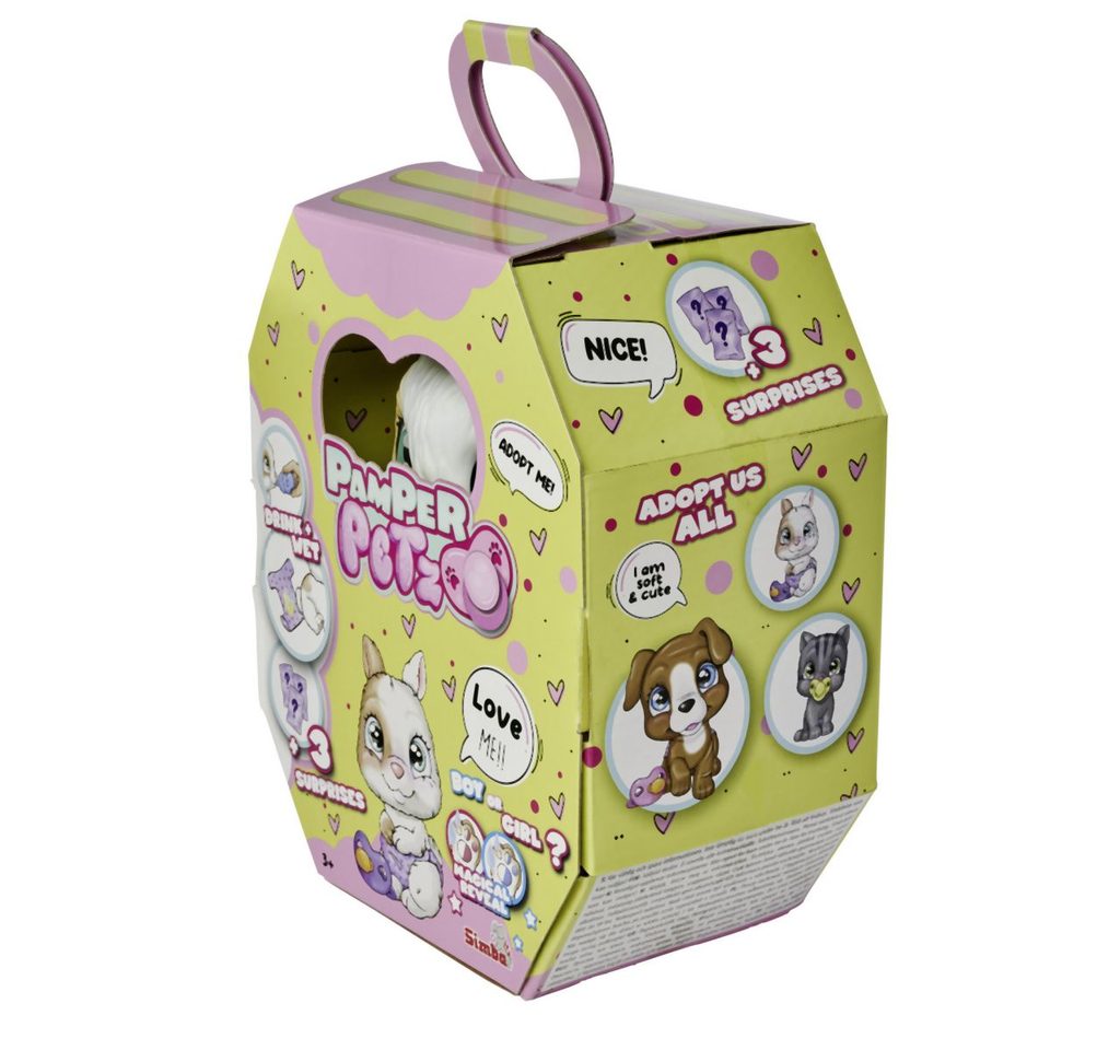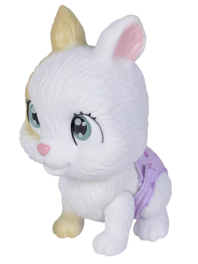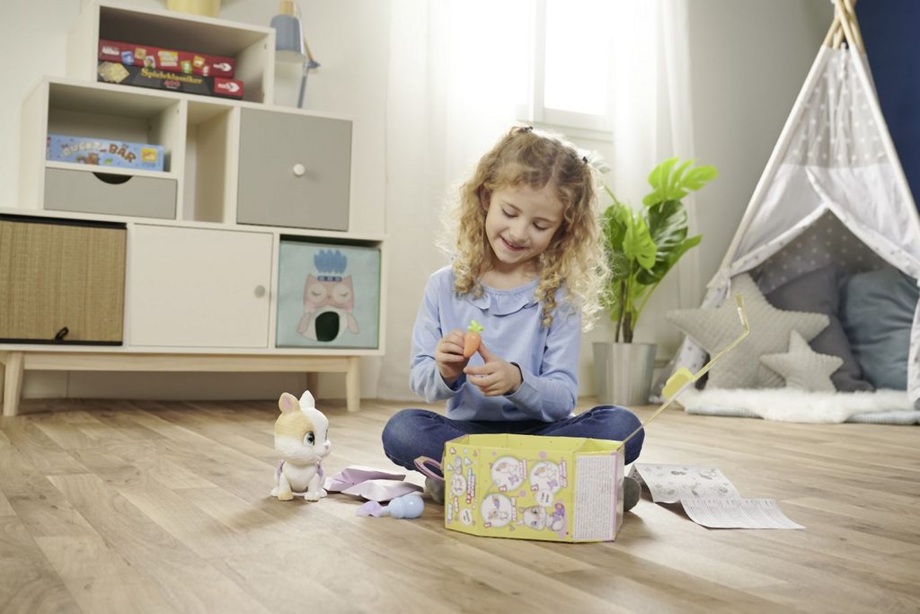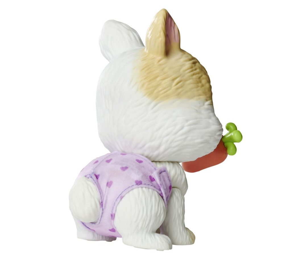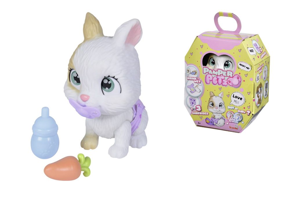 Roztomilé miminko králíčka s picí a čůrací funkcí, plenka s funkcí změny zbarvení po namočení, magická tlapka (po navlhčení se vybarví a ukáže pohlaví králíčka), adopční list a tři překvapení. Velikost 15 cm.
