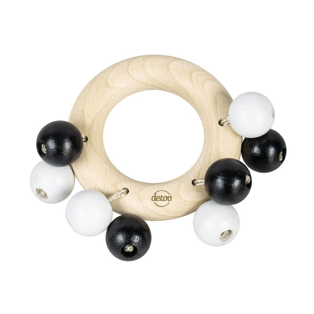 Dřevěné chrastítko kroužek a kuličky v moderní černobílé kombinaci barev. Snadno uchopitelné, rachtající.