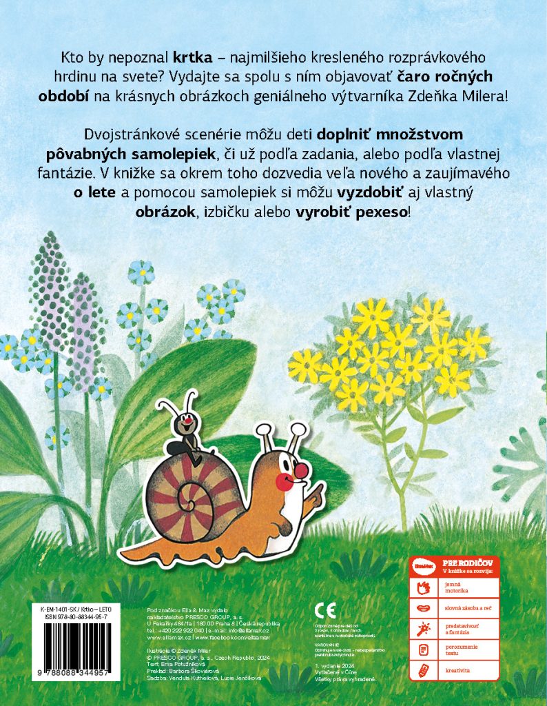 Kdo by neznal krtka – nejroztomilejšího kresleného pohádkového hrdinu na světě? Vydejte se spolu s ním objevovat kouzlo ročních období na krásných obrázcích geniálního výtvarníka Zdeňka Milera! Dvoustránkové scenerie mohou děti dolepovat spoustou roztomilých samolepek, ať už podle zadání, anebo podle vlastní fantazie. V knížce se kromě toho dozvědí mnoho nového a zajímavého o létě a za pomoci samolepek si také mohou vyzdobit vlastní obrázek, pokojíček nebo vyrobit pexeso!