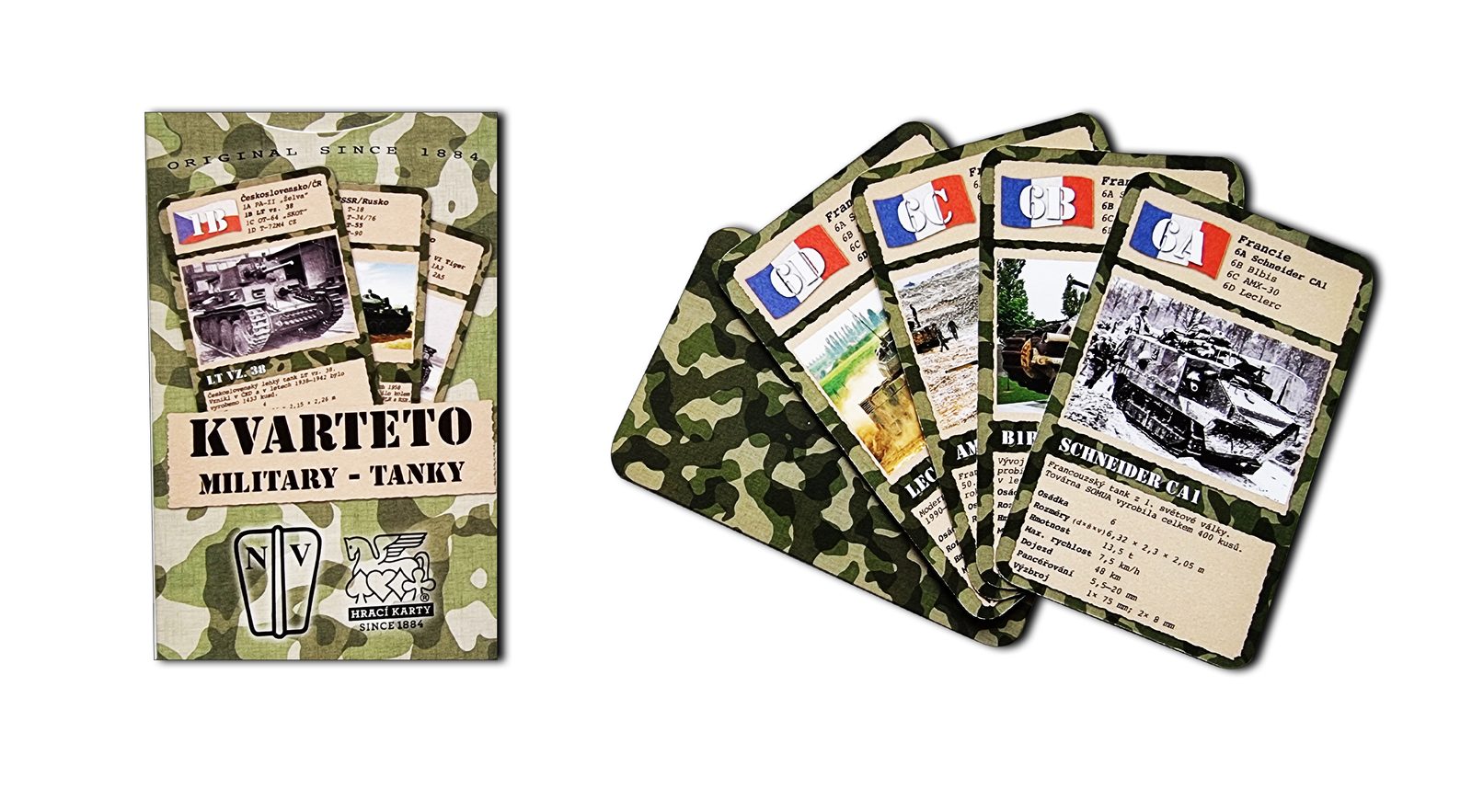 papír Casino Classic 310 g/m2 …edice her Military přináší ve zcela originální grafice kvarteto s fotografiemi historických i současných válečných obrněných vozidel a tanků. . Hra vznikla ve spolupráci s nakladatelstvím Naše vojsko – knižní distribuce, s.r.o.