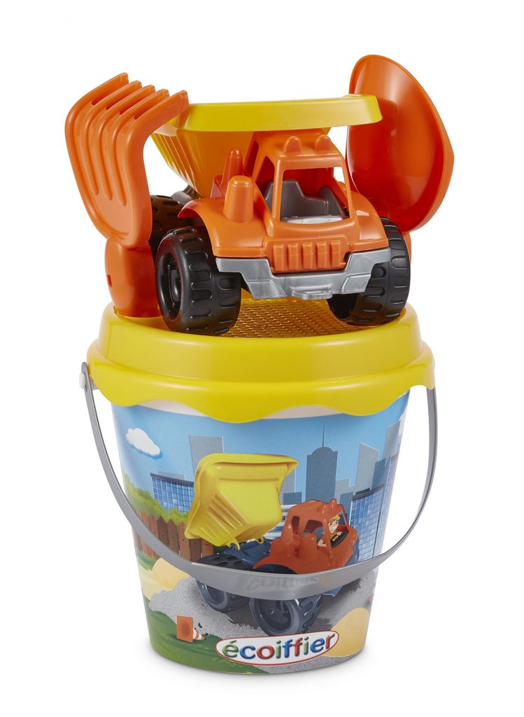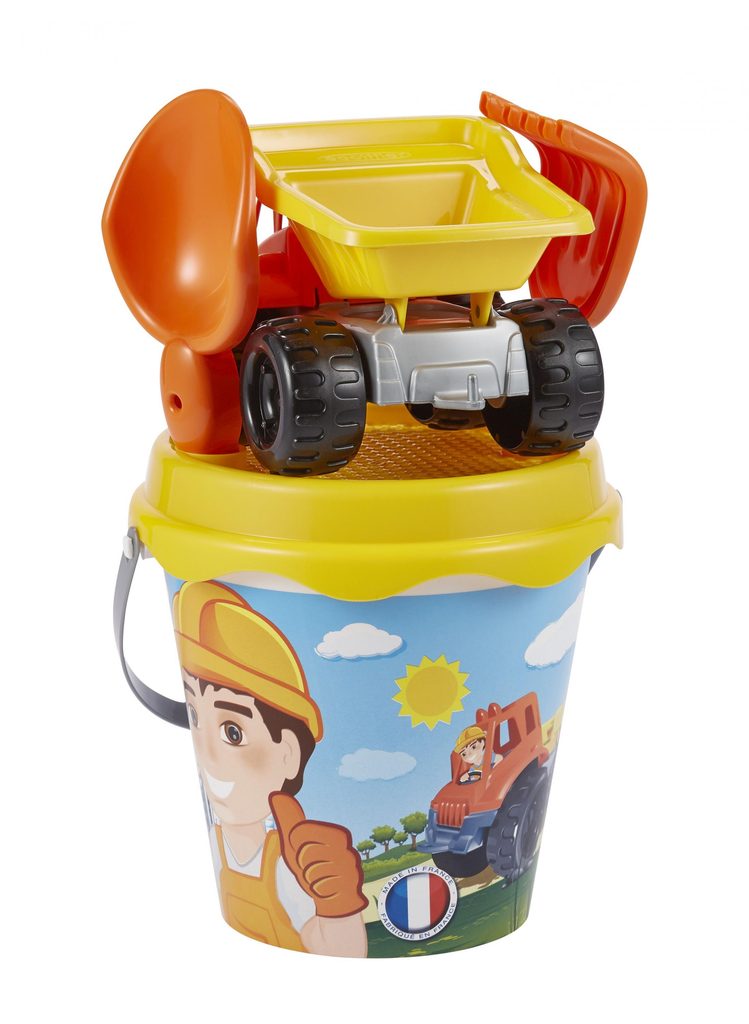 Set na písek s motivem stavby. Obsahuje kyblíček, sítko, nákladní autíčko, hrabičky a lopatičku. Průměr kyblíčku 18 cm, výška kyblíčku 17 cm.