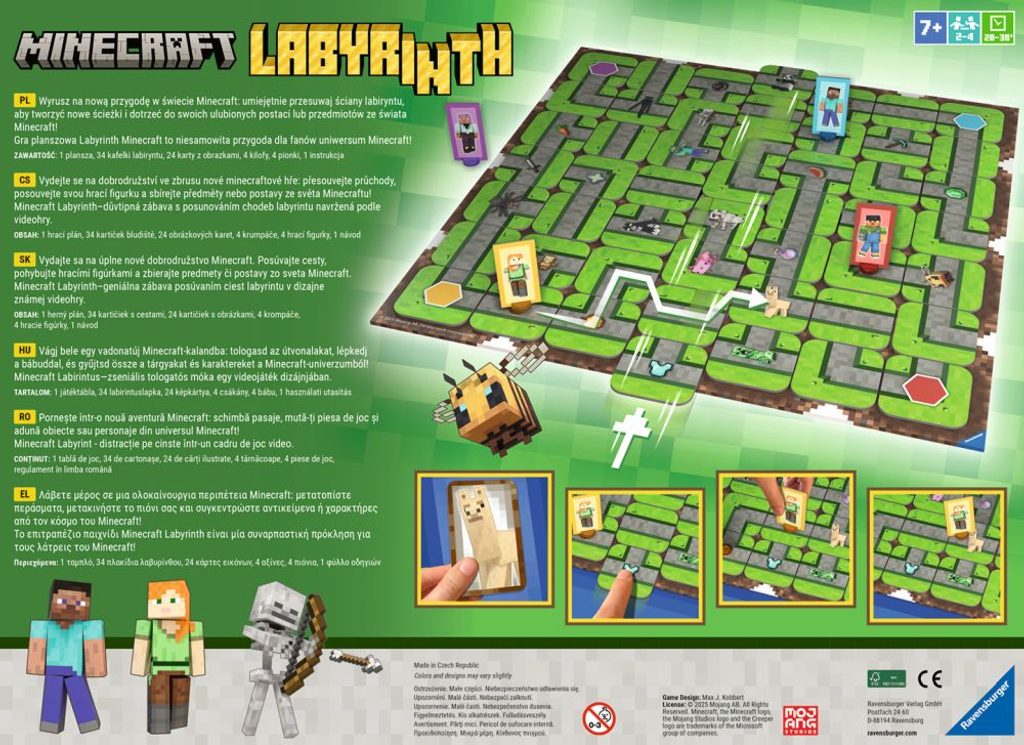 Obsahuje: 1 hrací plán, 34 kartiček bludiště, 24 obrázkových karet, 4 hrací figurky, 4 krumpáče Vydejte se na jedinečné dobrodružství do bláznivého Minecraftového bludiště! S krumpáčem v ruce vstupte do spletitých chodeb, kde na vás čekají vzácné předměty i tajemná stvoření. Tato hra vás provede důmyslným labyrintem, který se neustále mění – každý posun odhaluje nové cesty, ale také skryje ty, co už znáte. Přemýšlejte strategicky, měňte podobu bludiště ve svůj prospěch a objevte záludné trasy k vítězství. Triumf získá ten, kdo dokáže nejlépe přelstít bludiště a vrátit se s cennými objevy na své startovní políčko.