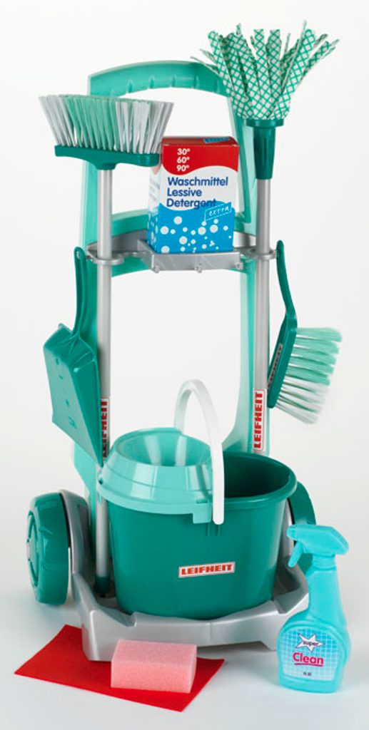 Praktický uklízecí vozík Leifheit s řadou příslušenství. Součástí balení je kbelík, mop, smeták, košťátko s lopatkou, prášek na praní, houbička, hadřík a nádoba s "čisticím" prostředkem. Materiál plast. Vhodné pro holčičky od 3 let.