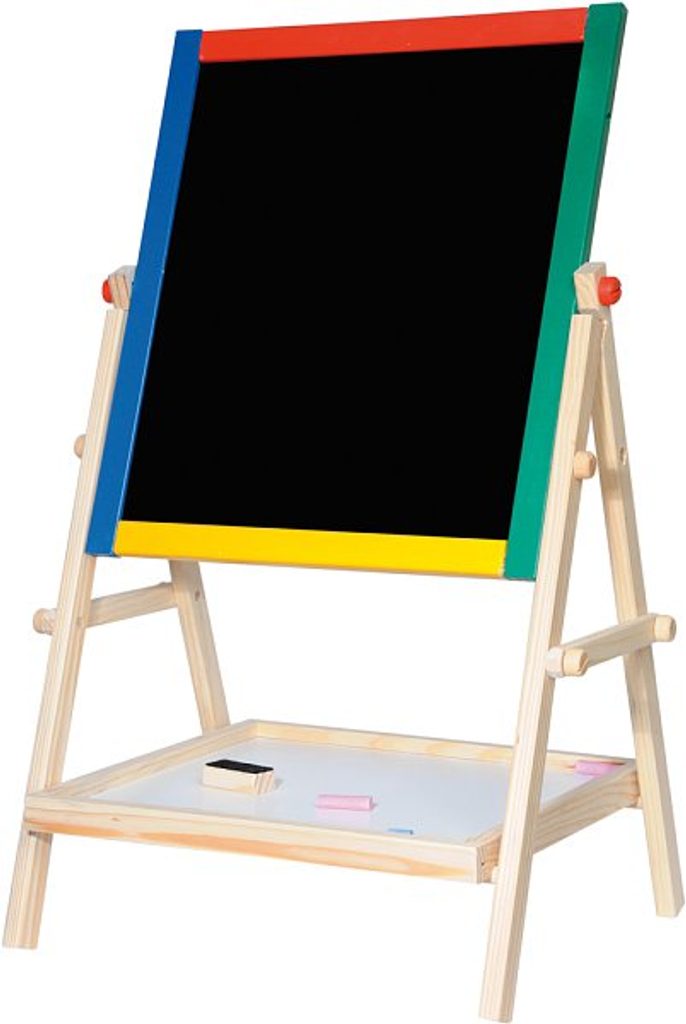 Jedna strana je bílá pro psaní suchými fixy a druhá černá pro klasické křídy. Bílá strana je vyrobena z kovového plechu, takže na ní drží magnetky.