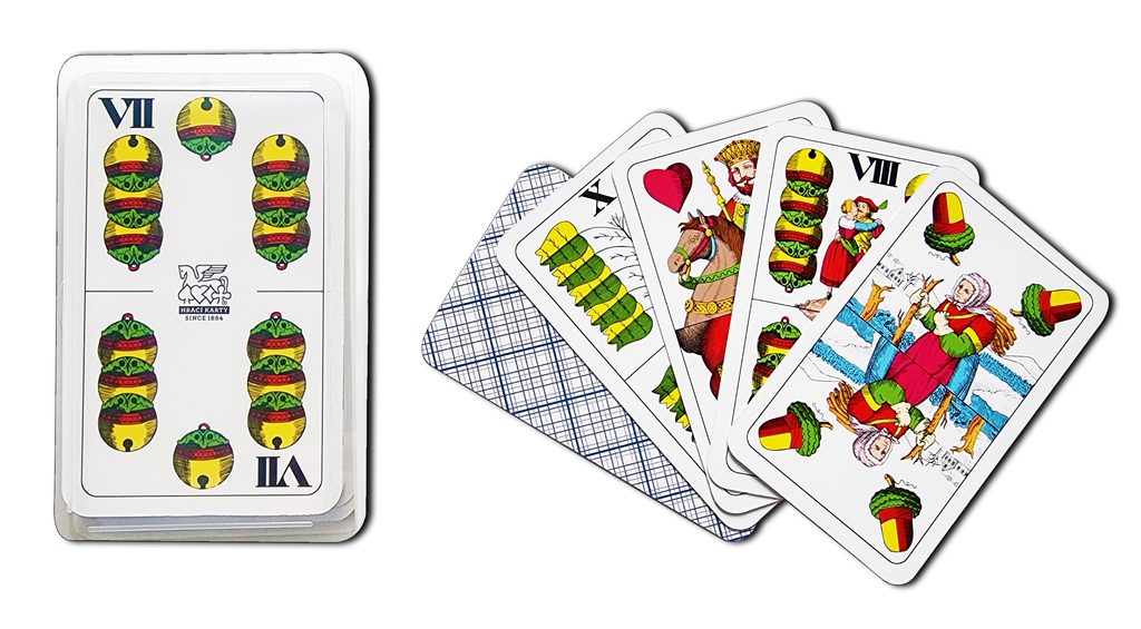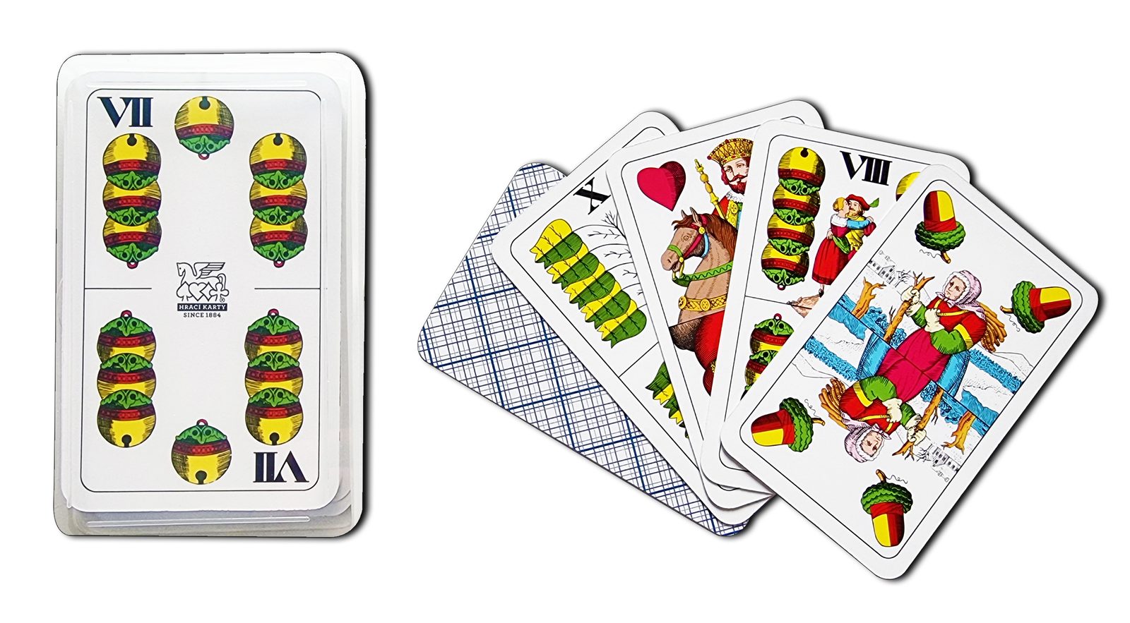 …herní sada zobrazuje na jednotlivých figurách legendu o Vilému Tellovi, obraz karet je s drobnými změnami stejný již 150 let. Obrazy jednotlivých es zobrazují roční období od jara do zimy. Károvaný revers je typický pro tuto hru. Mezi hráči je velmi oblíbený pro svoji praktičnost.