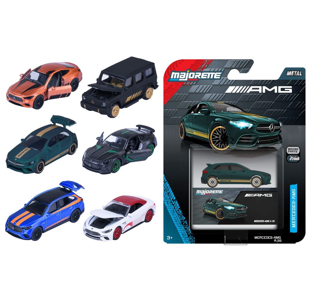 Kovové autíčko na volnoběh Mercedes-AMG Deluxe v měřítku 1:64, sběratelský box. Otevírací části, 6 druhů. Délka 7,5 cm.