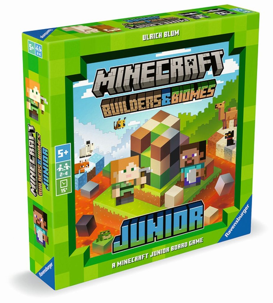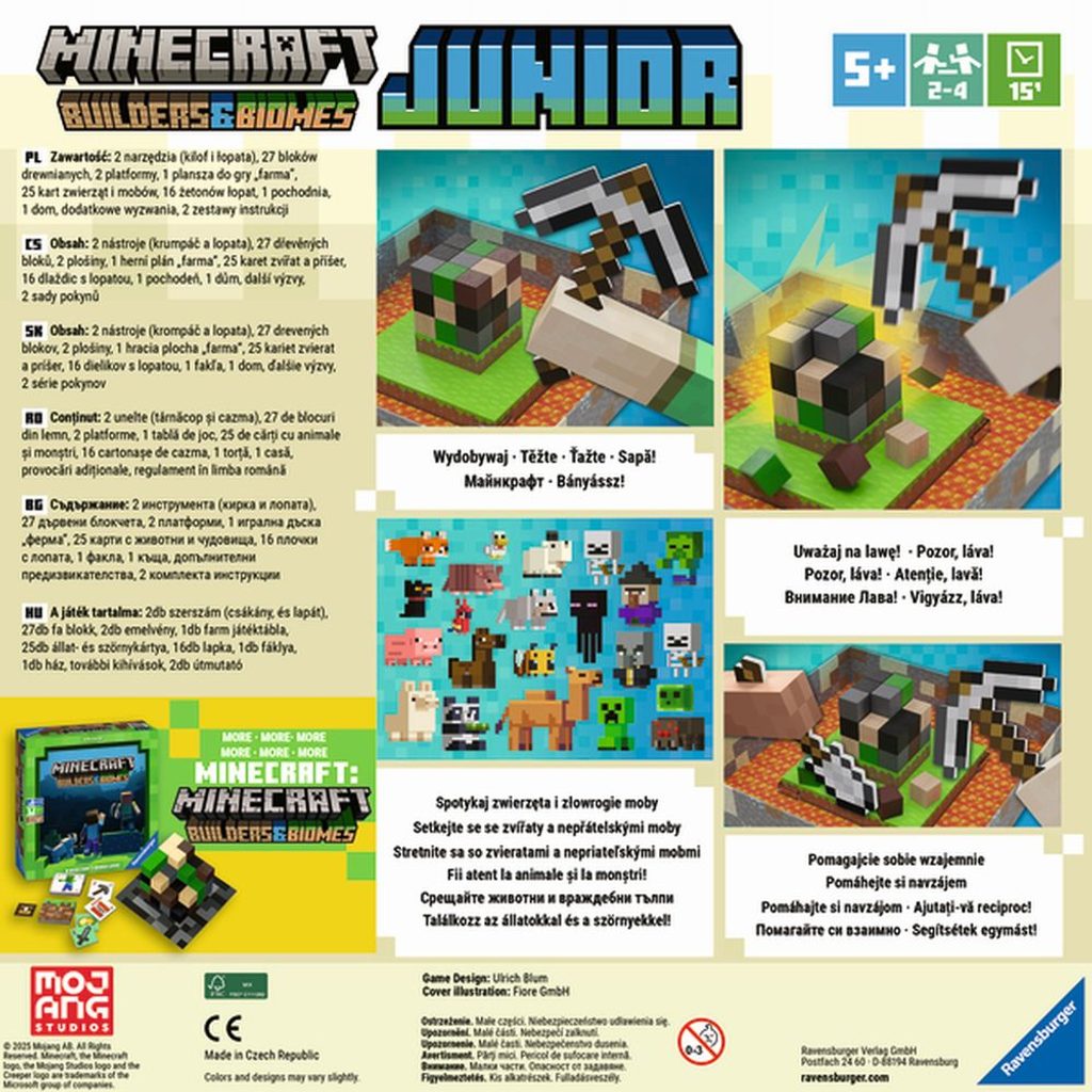 Obsah: 2 nástroje: krumpáč a lopata; 27 bloků: 6x dřevo (hnědá), 6x písek (béžová), 4x kámen (šedá), 5x uhlí (černá), 6x smaragd (zelená); Konstrukce v základně se 2 vložkami, 2 plošinami a 4 plastovými rohy; 1 Podpůrná konstrukce; 1 herní deska farmy; 25 karet: 17 zvířat a 8 příšer; 16 dlaždic s lopatou: 12 dlaždic se železnou lopatou a 4 dlaždice s diamantovou lopatou; 1 pochodeň; 3 louky; 1 Dům; 12 dlaždic s výzvou V Minecraft: Builders & Biomes Junior je vaším úkolem společně postavit farmu plnou zvířat dříve, než ji zaplaví příšery! Sbírejte potřebné bloky, stavějte stodoly a pečlivě vybírejte místa pro každé zvíře, aby žádný blok nespadl do lávy. Čekají vás i nebezpeční nepřátelé – podaří se vám dokončit farmu včas a vytvořit bezpečný domov pro všechna svá zvířátka? Spolupráce a rychlá rozhodnutí jsou klíčem k úspěchu!
