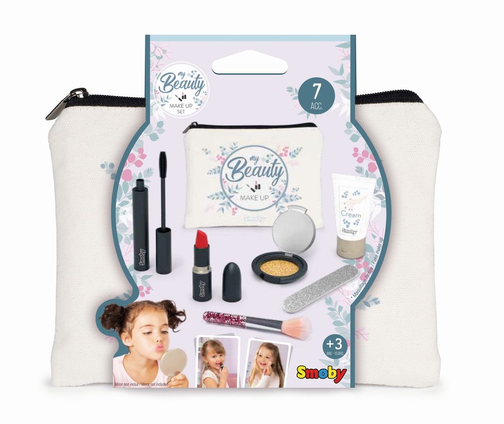 Kosmetická taštička Smoby My Beauty Make Up se rtěnkou, řasenkou, očními stíny, štětečkem, glitrovým pilníkem, krémem na ruce. Atrapy kosmetiky. Rozměry: 18 x 2 x 13 cm. Rozměry taštičky: 17,5 x 13,5 cm.