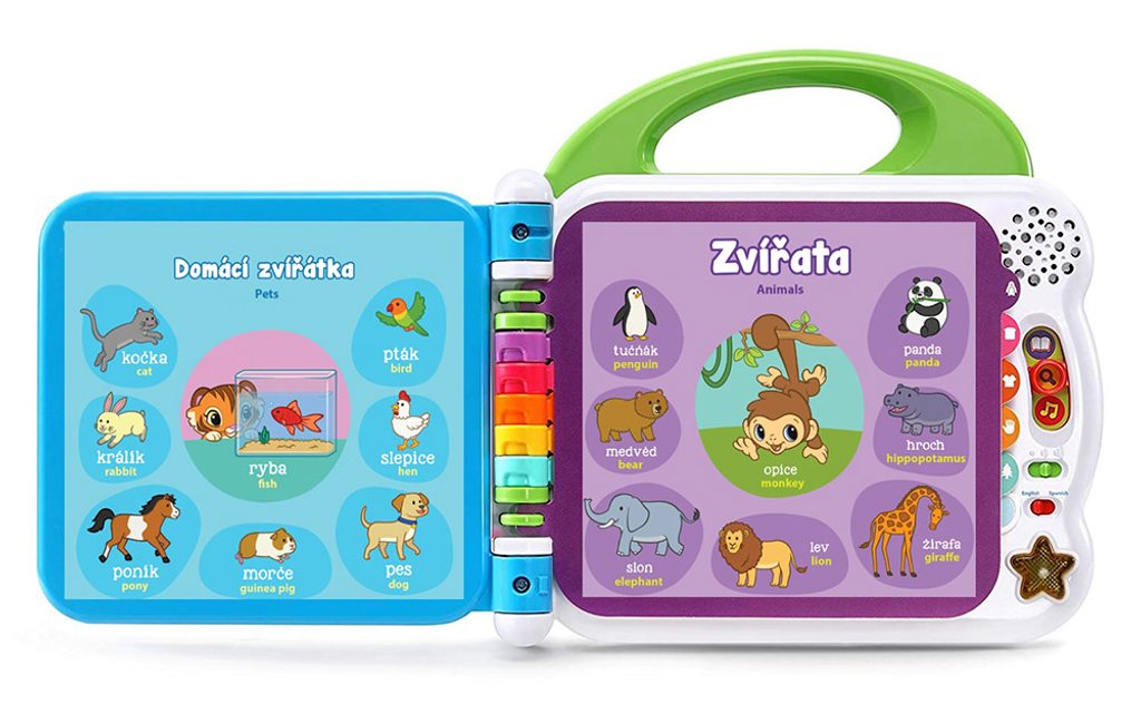 Dotykem na obrázek se slova přehrají. Spousta zábavných zvuků a efektů udělá z poznávání skvělou zábavu. Všechno co je v knize, včetně slov, písní a instrukcí je možné poslouchat jak v angličtině, tak v češtině.