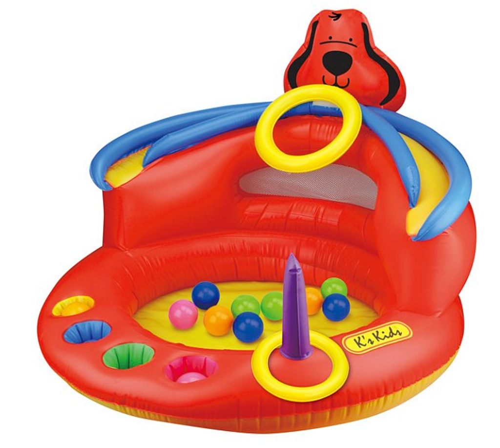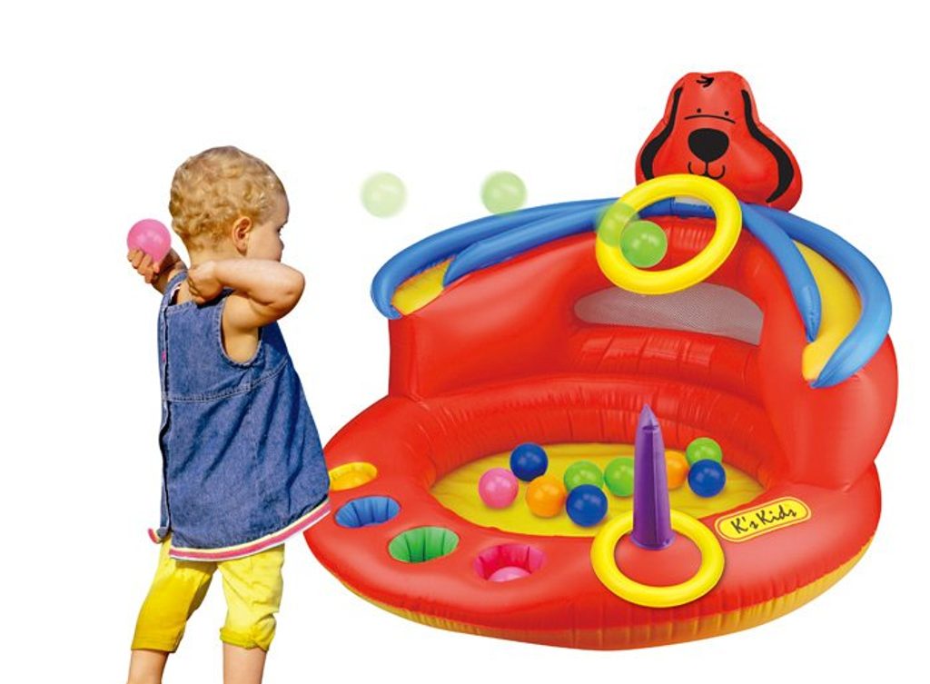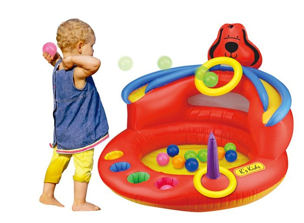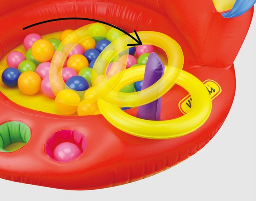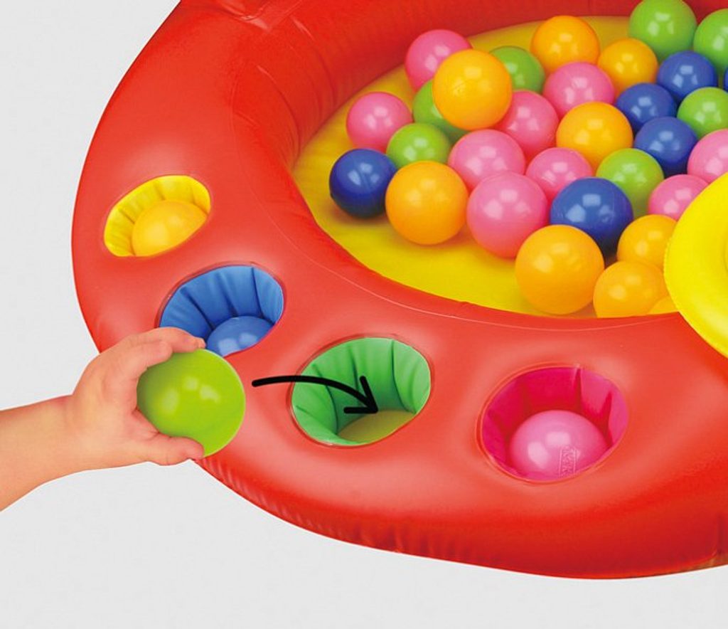 Děti milují míčky! S nafukovací arénou Patrik, která obsahuje 20 míčků, si děti užijí spoustu zábavy. Připevni žlutý kroužek pod nos pejska a zkus se do něj trefit míčky. Hoď nebo polož míček na žluto-modrou klouzačku a sleduj, jak se klouže dolů do arény. Poznávej barvy. Najdi správnou barvu míčku a vlož jej do barevného otvoru. Pro podporu koordinace oko-ruka je zde připraveno házení kroužků. Tato hračka není určena na vodu! Věk: 12M+. Rozměr: 60 x 93 x 93 cm.