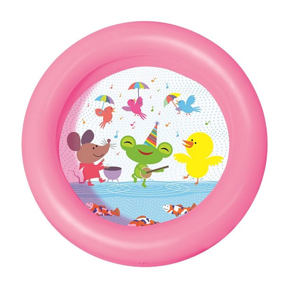 Nafukovací bazének s veselými obrázky na podlaze. Bazén má 2 barevné prstence v pastelových barvách.