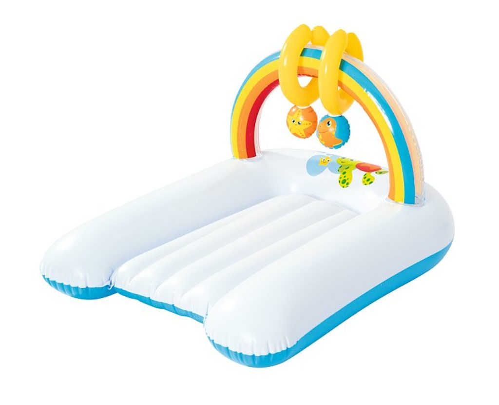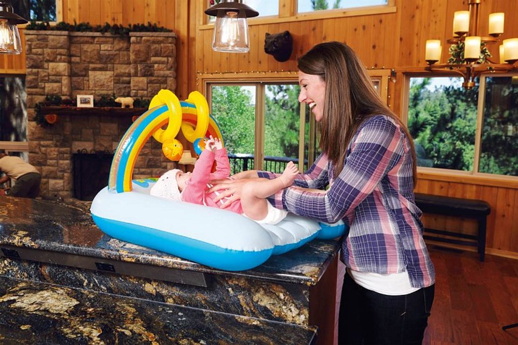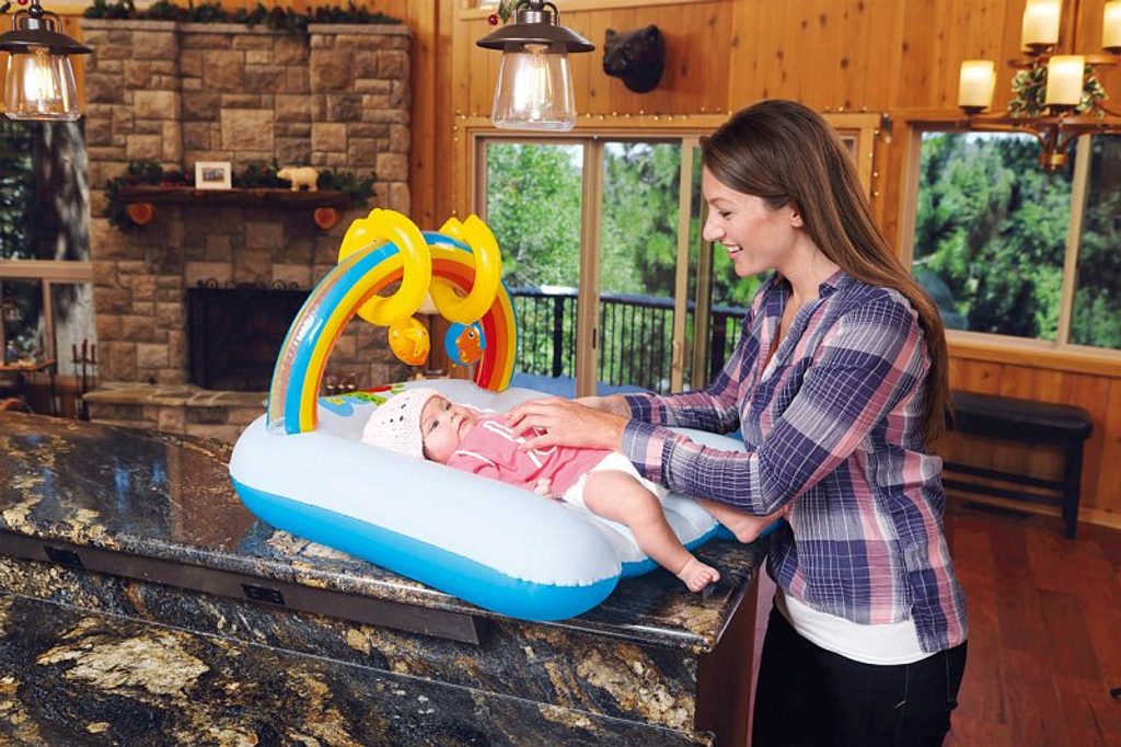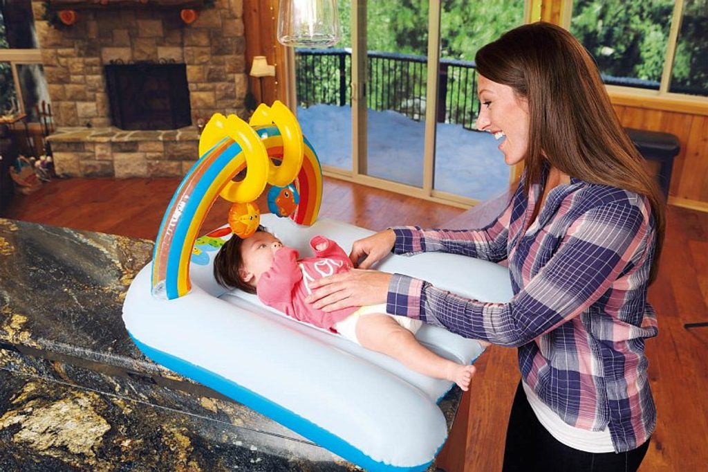 Nafukovací přebalovací podložku ocení nejen maminky, ale také ti nejmenší! Podložka zaručuje vysoký komfort při ležení. Při přebalování se děti lehce zabaví dvěmi hračkama, které jsou součástí barevné duhy. Hračky vydávají zvuky. Barevné provedení je vhodné pro kluky i holčičky. Součástí balení je i opravná sada. Vyrobeno z kvalitního a odolného vinylu o síle 0,27/0,22 mm. Věk: 0+. Rozměr: 81 x 63 x 46 cm.