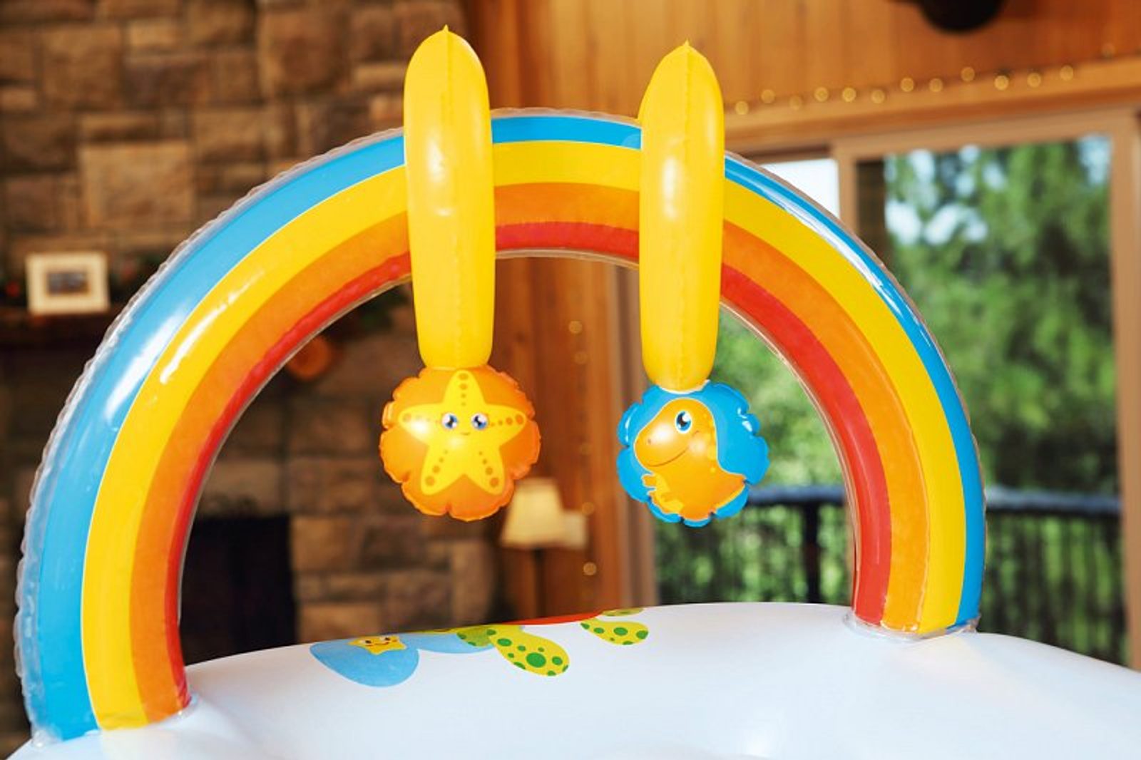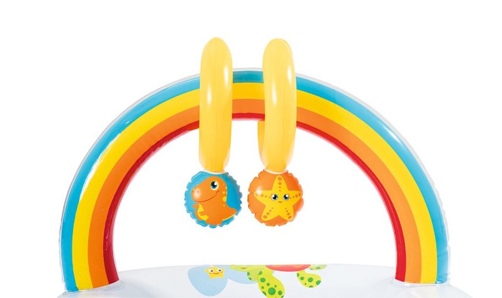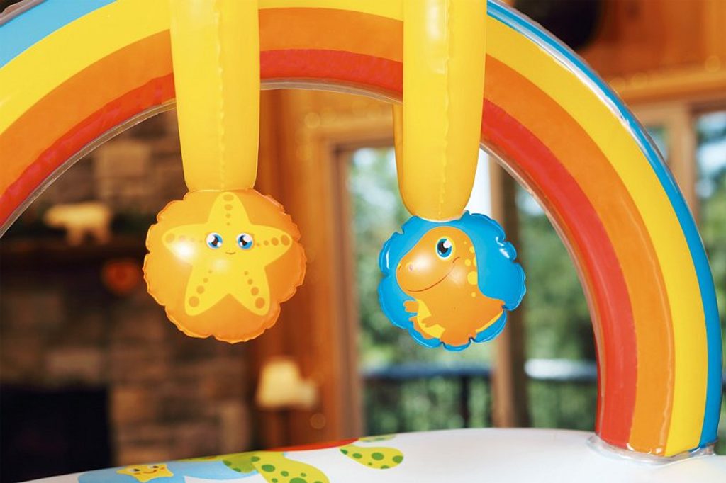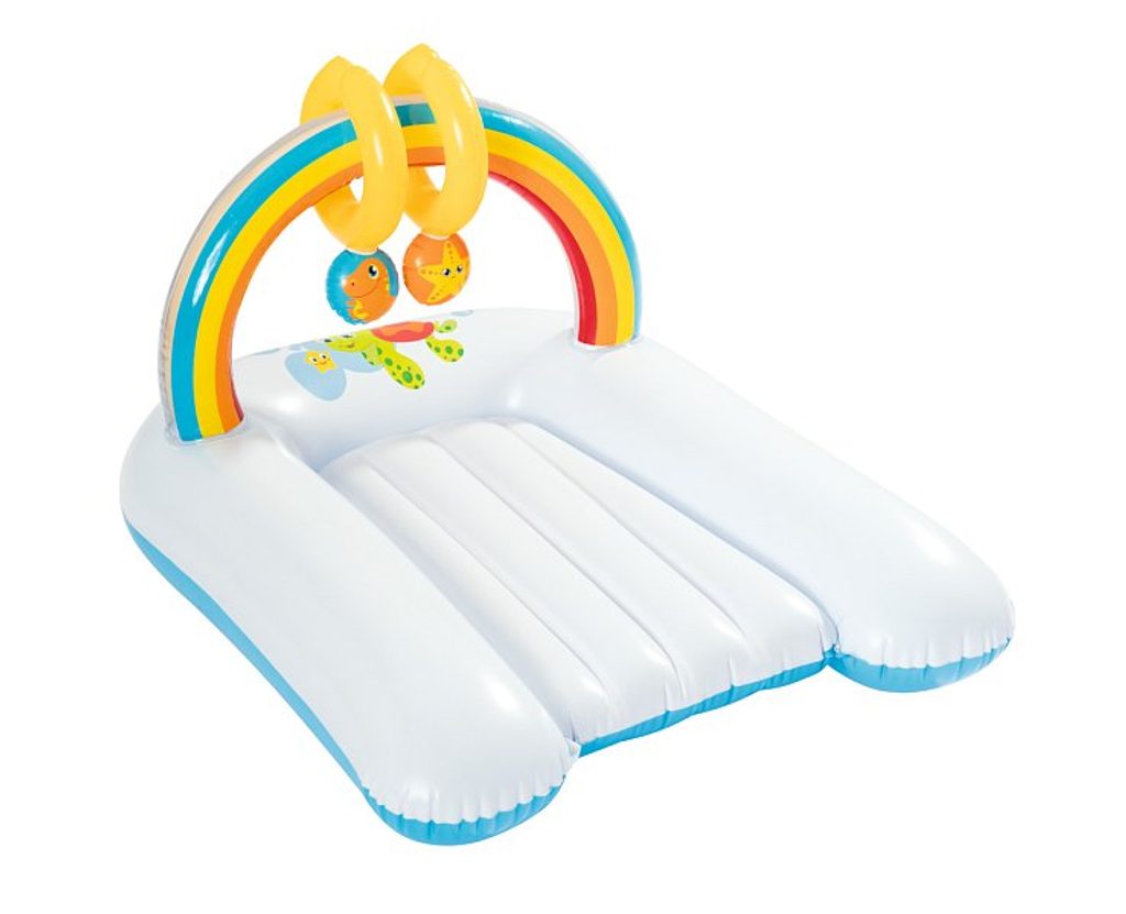 Nafukovací přebalovací podložku ocení nejen maminky, ale také ti nejmenší! Podložka zaručuje vysoký komfort při ležení. Při přebalování se děti lehce zabaví dvěmi hračkama, které jsou součástí barevné duhy. Hračky vydávají zvuky. Barevné provedení je vhodné pro kluky i holčičky. Součástí balení je i opravná sada. Vyrobeno z kvalitního a odolného vinylu o síle 0,27/0,22 mm. Věk: 0+. Rozměr: 81 x 63 x 46 cm.