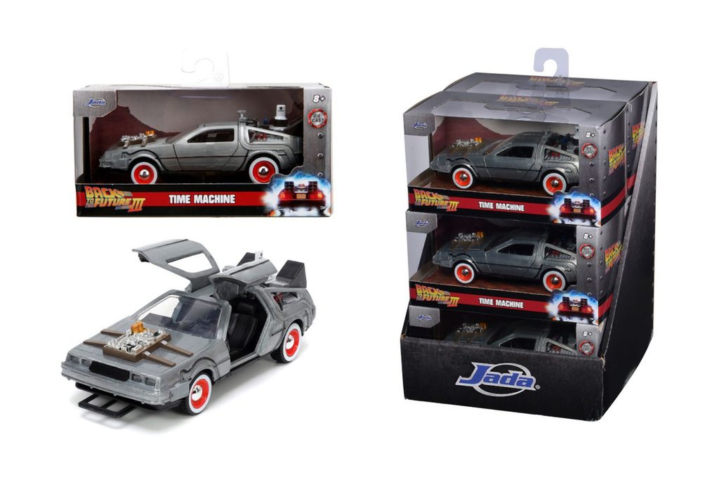 Kovový model Time Machine Back to the Future 3 na volnoběh v měřítku 1:32 s otevíracími dveřmi. Displej obsahuje 6 ks.