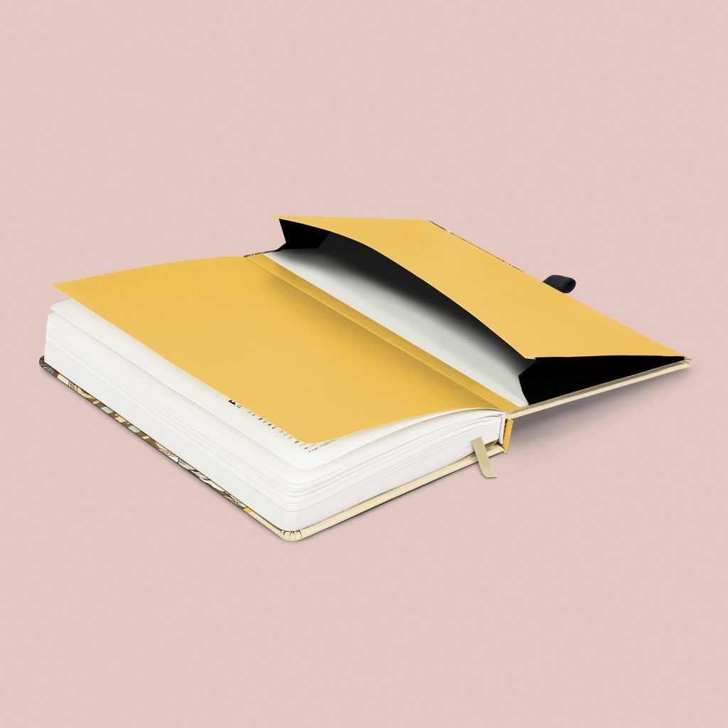 Notes v pevných deskách s motivem díla Alfonse Muchy, s uzavíráním na gumičku, kapsou na drobnosti a poutkem na tužku. Vevnitř najdete 172 tečkovaných stran na žlutém papíře pro zapsání všech vašich nápadů.