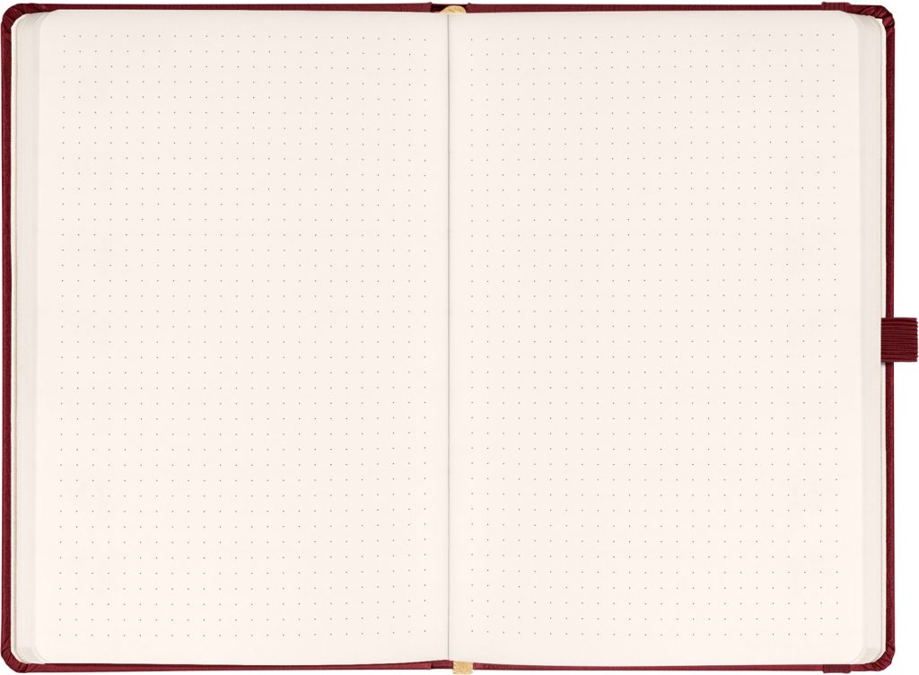 Tečkovaný notes Balacron v provedení bordó. Povrch diáře si získal oblibu díky kvalitnímu svrchnímu materiálu, který je extrémně odolný vůči vnějšímu poškození.
