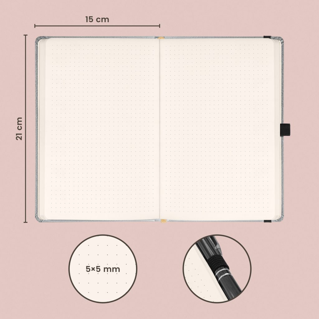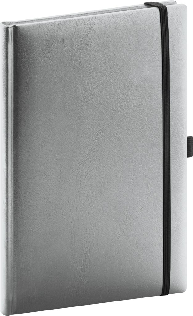 Tečkovaný notes Balacron ve stříbrném provedení. Povrch diáře si získal oblibu díky kvalitnímu svrchnímu materiálu, který je extrémně odolný vůči vnějšímu poškození.