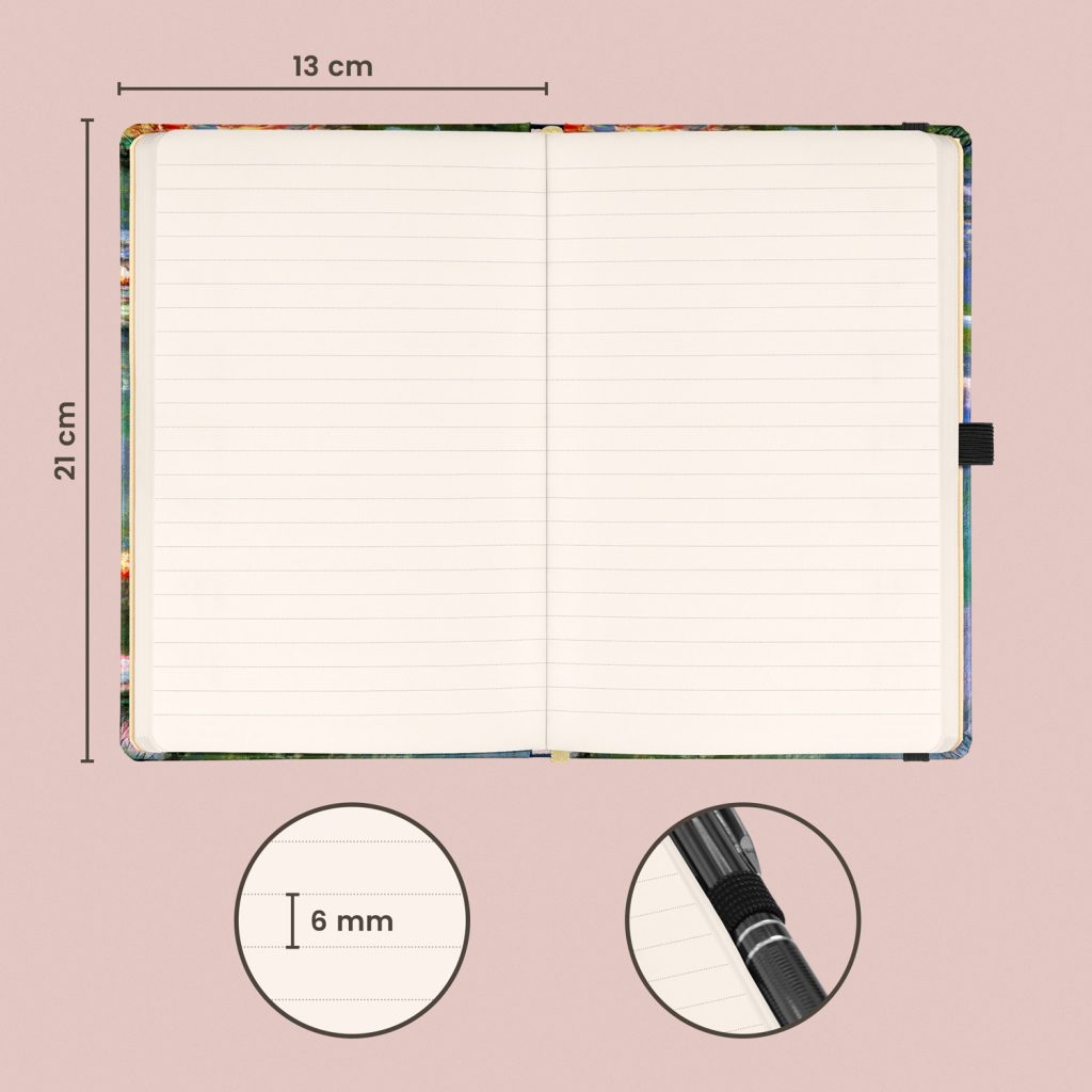 • Vazba: tuhá knižní s gumičkou na uzavření a poutkem na tužku