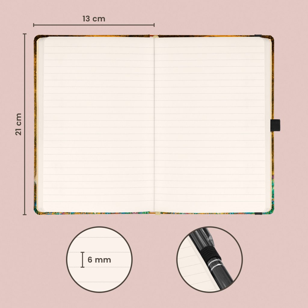 Kvalitní linkovaný notes v pevných deskách s uzavíráním na gumičku, poutkem na tužku a vnitřní kapsou na drobnosti. Uvnitř najdete 172 tečkovaných stran na žlutém papíře pro zapsání všech vašich nápadů. Linkovaný zápisník můžete použít jako deník, psát do něj hluboké myšlenky nebo pracovní poznámky.