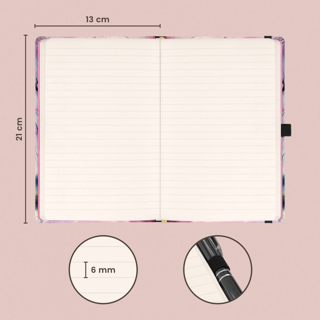 • Vazba: tuhá knižní s gumičkou na uzavření a poutkem na tužku