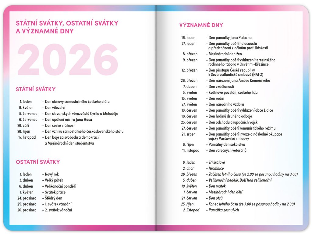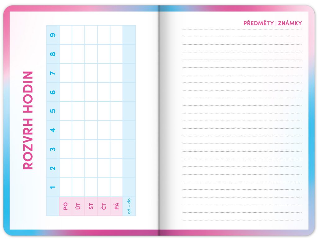 Školní diář obsahuje přehled na rok 2025 a 2026, české týdenní řádkové kalendárium se jmény a svátky, rozvrh hodin, prostor na poznámky a základní poznatky z češtiny, angličtiny, matematiky a fyziky pro školáky a školačky. Kalendárium začíná v září 2025 a končí v prosinci 2026.
