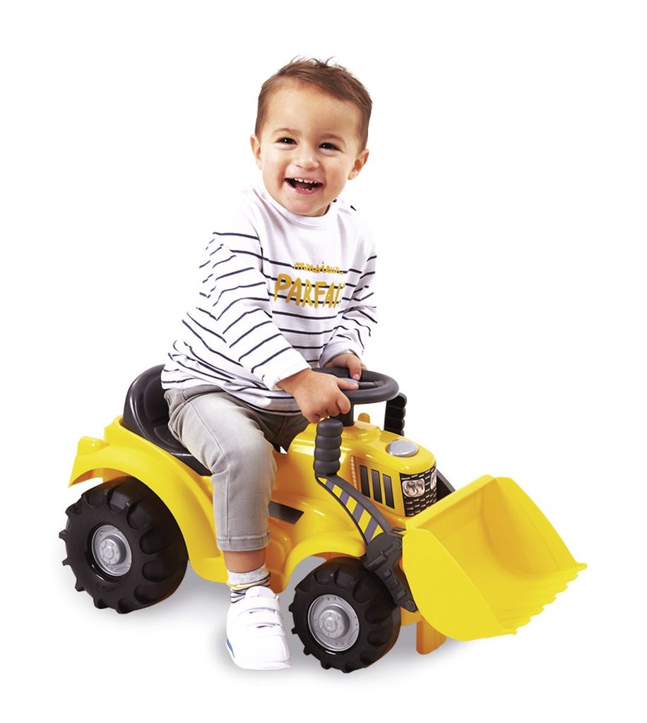 Odrážedlo bagr má přední lžíci ovládanou pomocí dvou rukojetí, protiskluzový volant (bez funkce řízení), robustní plastová kola, úložný prostor pod sedadlem. Rozměry: 66 x 32,5 x 28 cm.