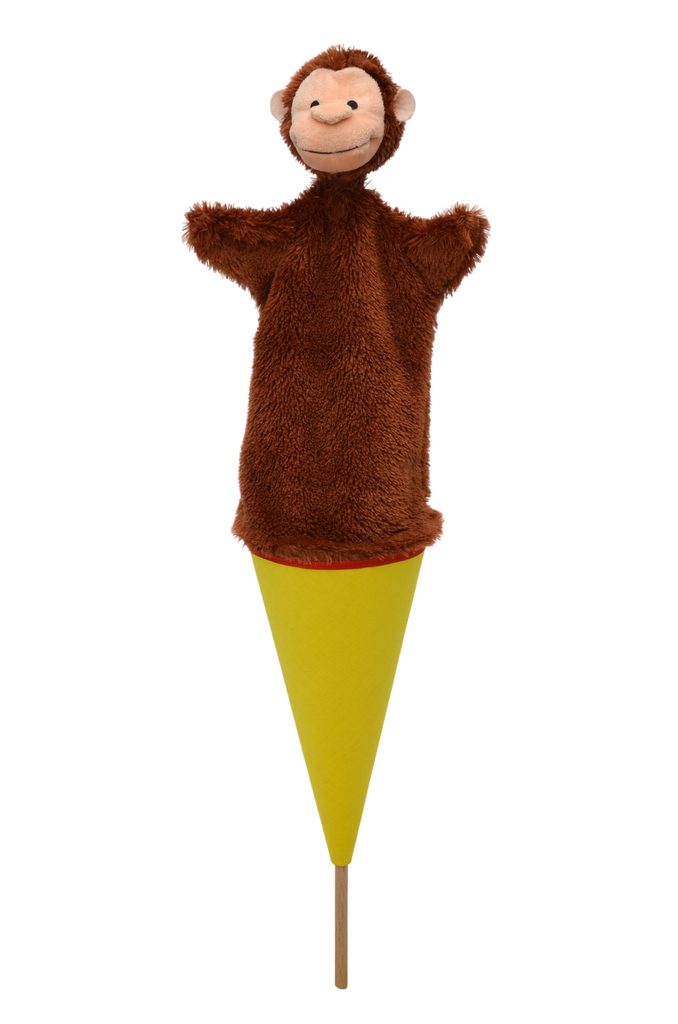 Velký textilní kornoutový maňásek, ovládaný dřevěnou tyčkou, s otvorem pro ovládání ručiček. Vyrobeno v ČR.