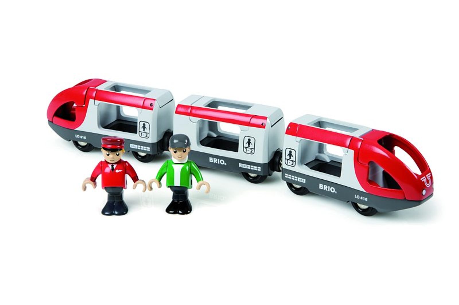 Moderní osobní vlak v červeno-bílé barvě. Součástí jsou dva panáčci. Tato souprava kompatibilní se všemi dřevěnými vláčkodráhami na trhu.