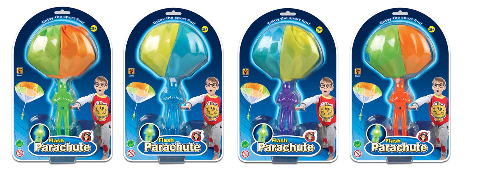 Svítící parašutista. Vyhoď parašutistu do výška a dívej se, jak se snáší dolů.