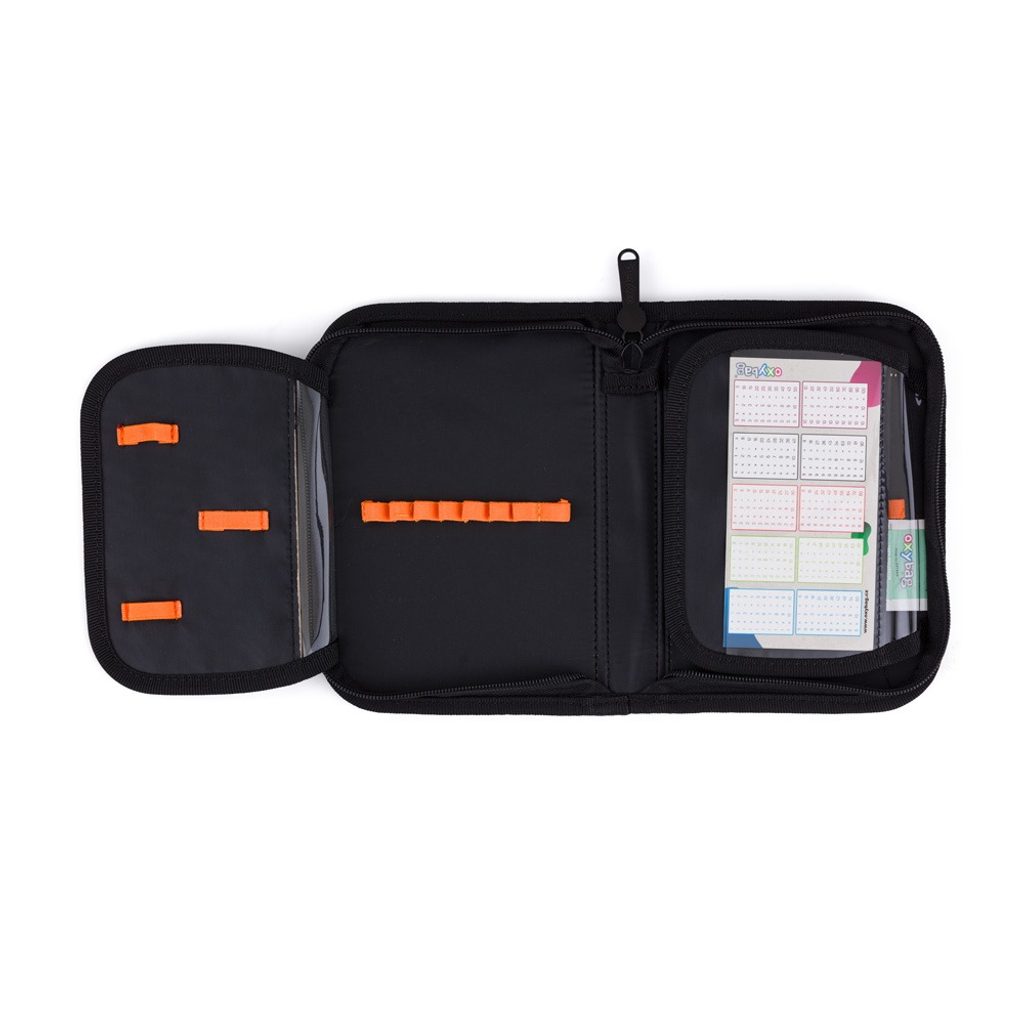 Jednopatrový školní penál s 2 chlopněmi, prázdný obsahuje 25 gumových poutek pro uchycení psacích potřeb. Na vnitřních chlopních jsou průhledné fólie pro rozvrh hodin.