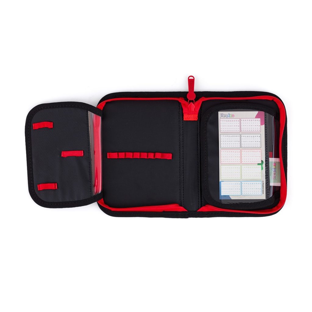 Jednopatrový školní penál s 2 chlopněmi, prázdný obsahuje 25 gumových poutek pro uchycení psacích potřeb. Na vnitřních chlopních jsou průhledné fólie pro rozvrh hodin.