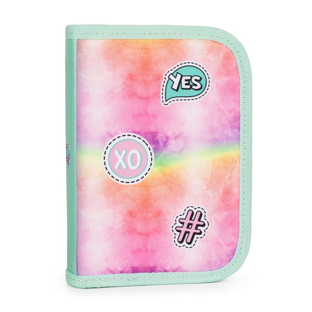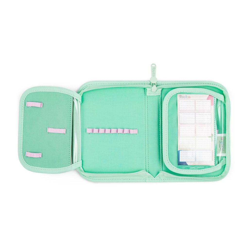 Jednopatrový školní penál s 2 chlopněmi, prázdný obsahuje 25 gumových poutek pro uchycení psacích potřeb. Na vnitřních chlopních jsou průhledné fólie pro rozvrh hodin.