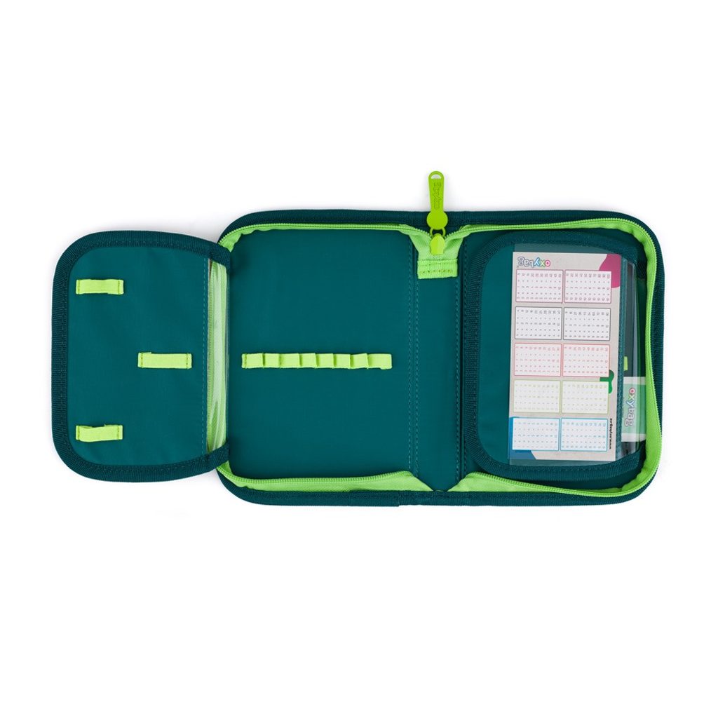 Jednopatrový školní penál s 2 chlopněmi, prázdný obsahuje 25 gumových poutek pro uchycení psacích potřeb. Na vnitřních chlopních jsou průhledné fólie pro rozvrh hodin.