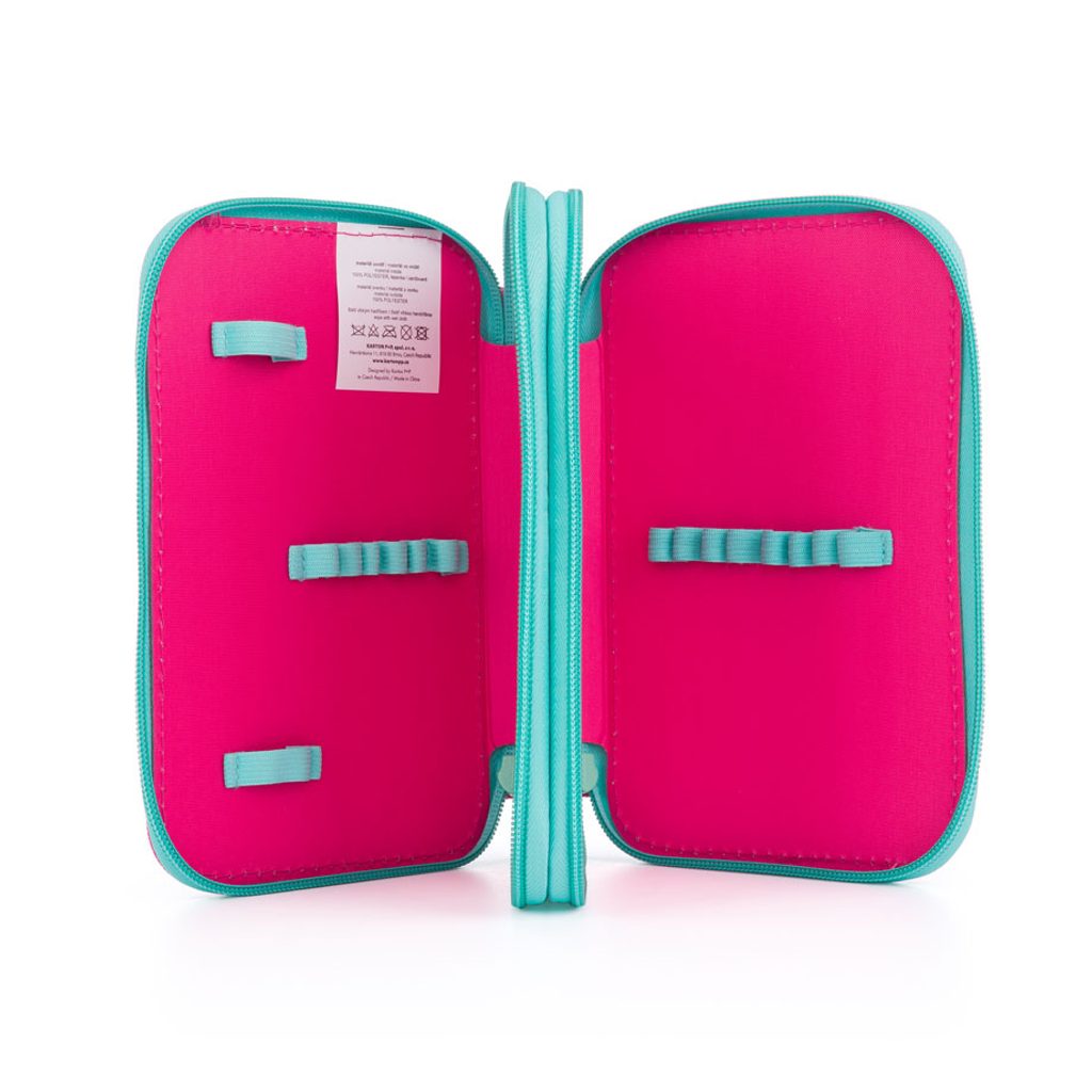 Školní penál dvoupatrový bez náplně s motivem jednorožce. Penál obsahuje 25 gumových poutek pro uložení všech psacích potřeba a drobností potřebných k výuce. Penál má pevný zip s velkými taháčky pro snadnou manipulaci. Jedno patro je opatřeno průhlednou přihrádkou pro týdenní rozvrh.