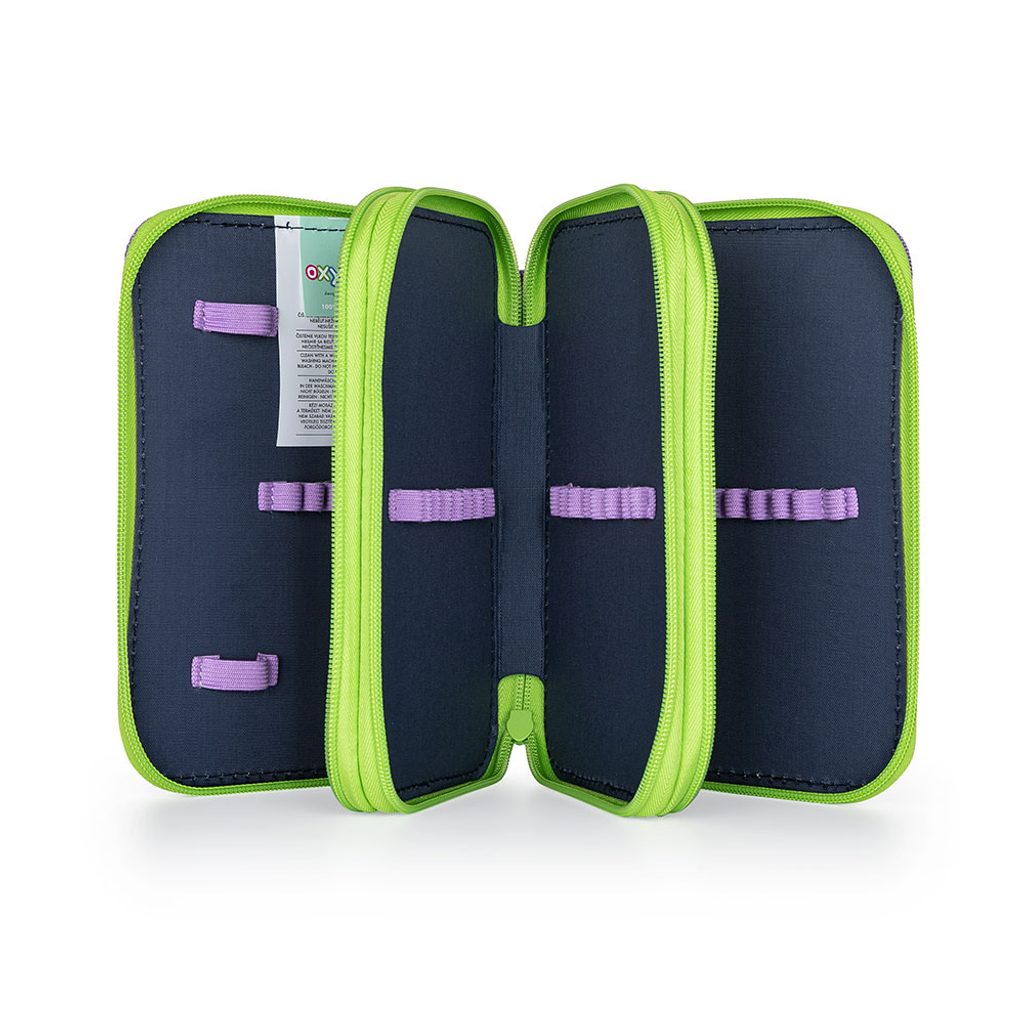 Školní penál třípatrový bez náplně. Penál obsahuje 40 gumových poutek pro uložení všech psacích potřeb a drobností potřebných k výuce. Penál má pevný zip s velkými taháčky pro snadnou manipulaci. Jedno patro je opatřeno průhlednou přihrádkou pro týdenní rozvrh.